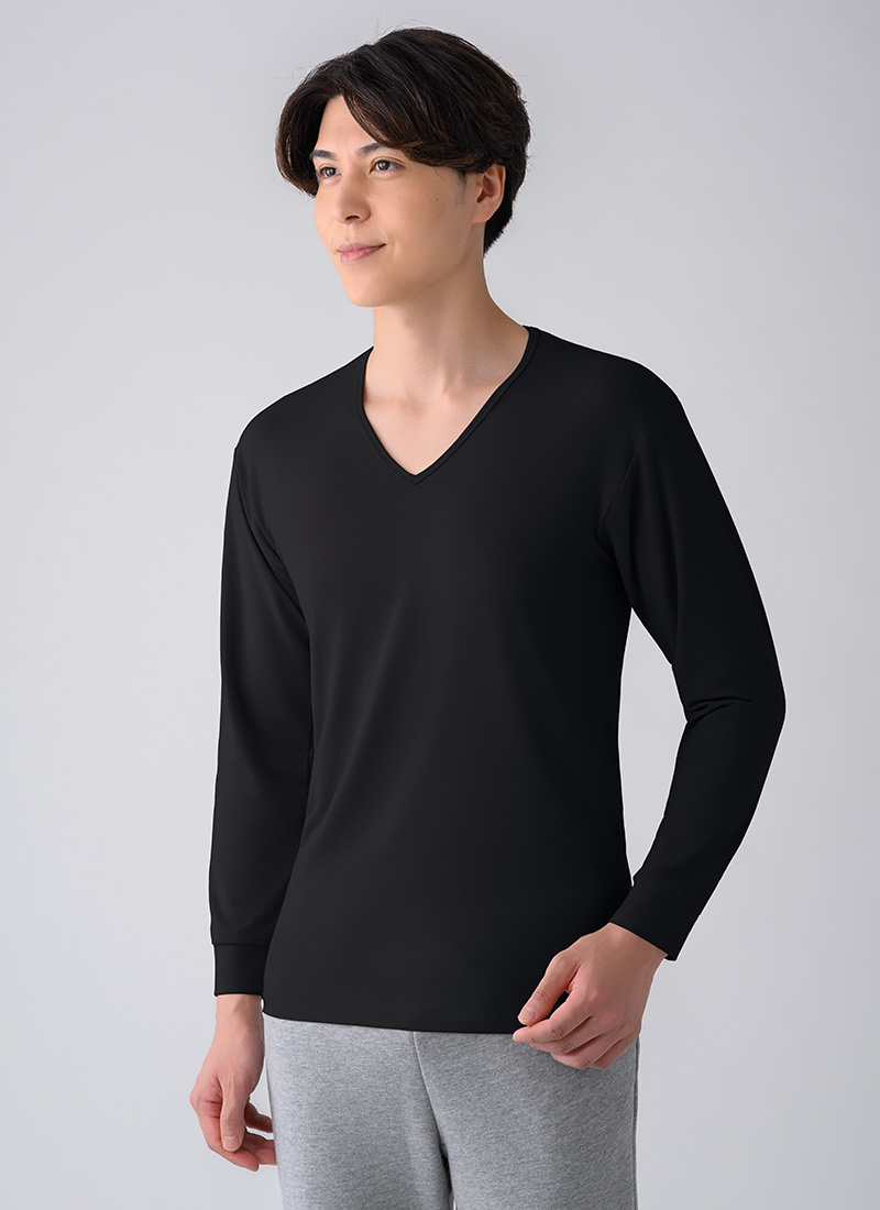 さらっと心地よく着られる吸水速乾性で、汗をかいても乾きやすいです。重ね着することが多い秋冬でもムレにくくて快適に着用いただけます。Vネック仕様なので、ワイシャツやポロシャツの下に着ても響きません。