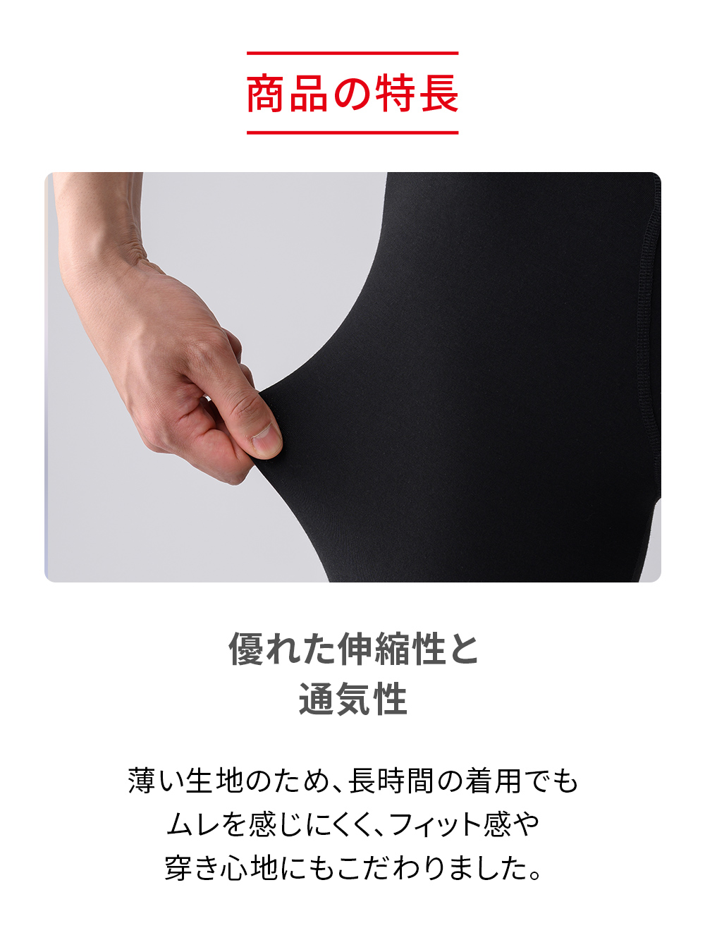薄い生地のため、長時間の着用でもムレを感じにくく、フィット感や穿き心地にもこだわりました。