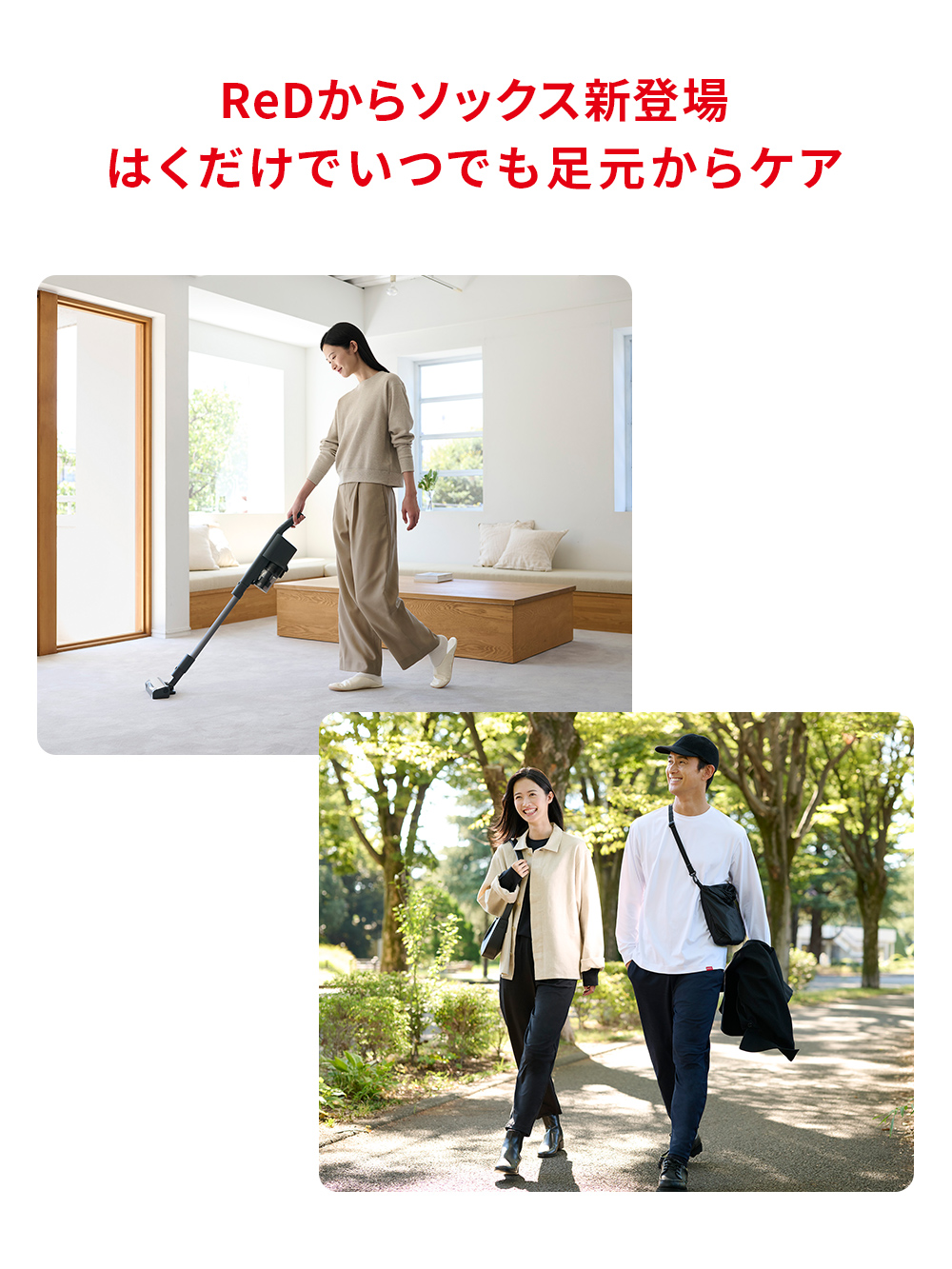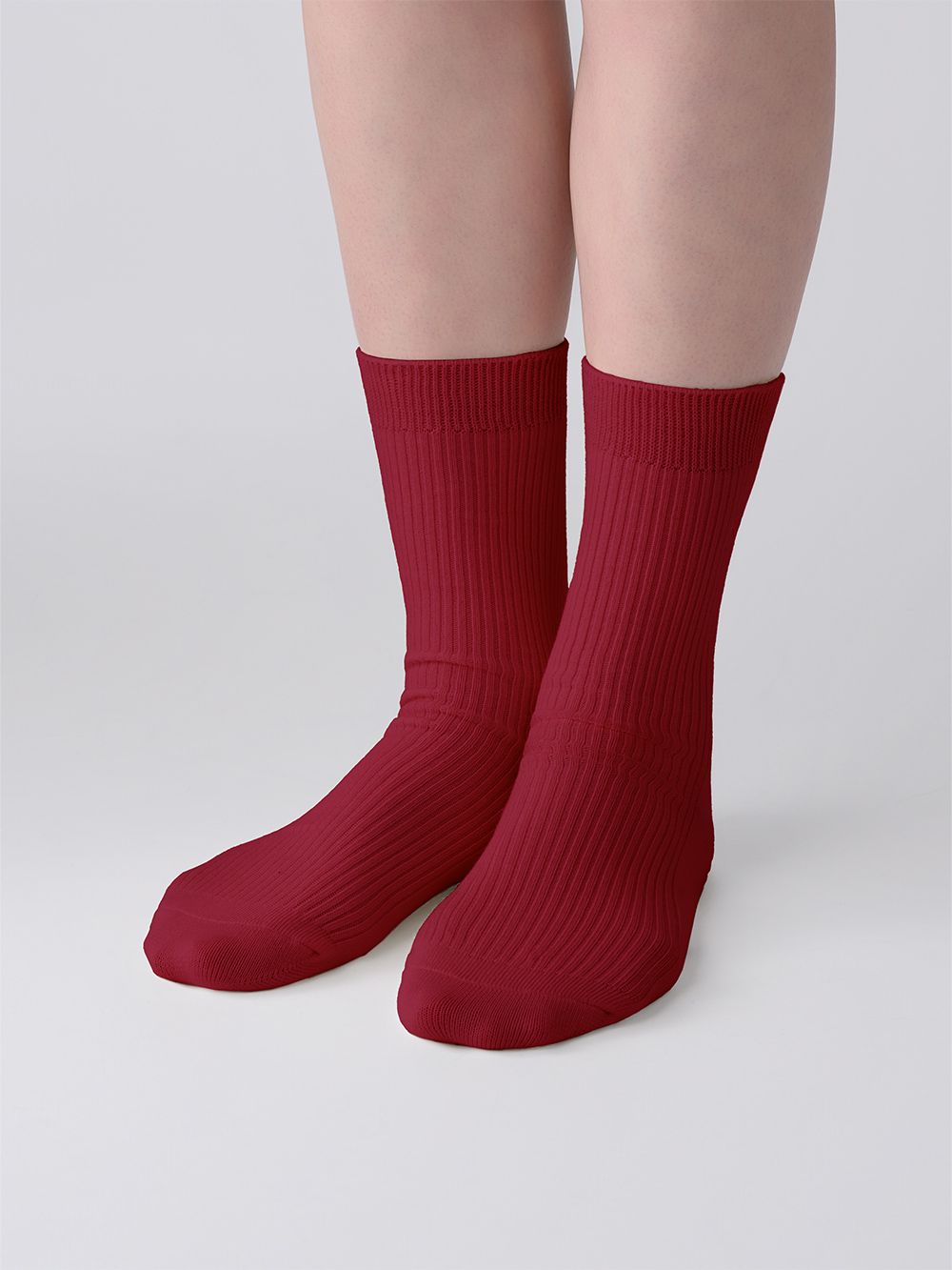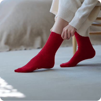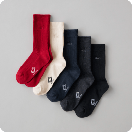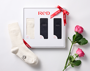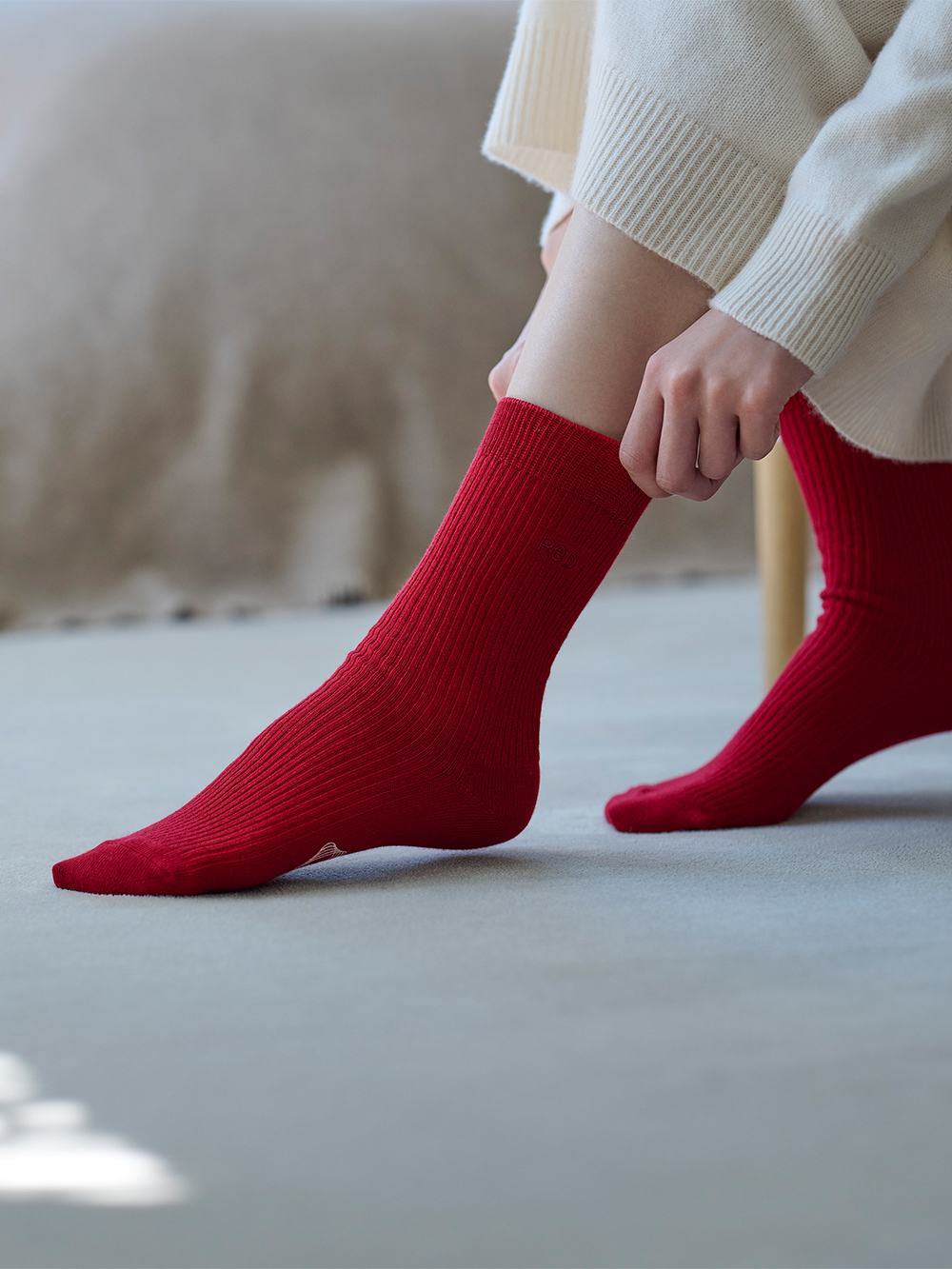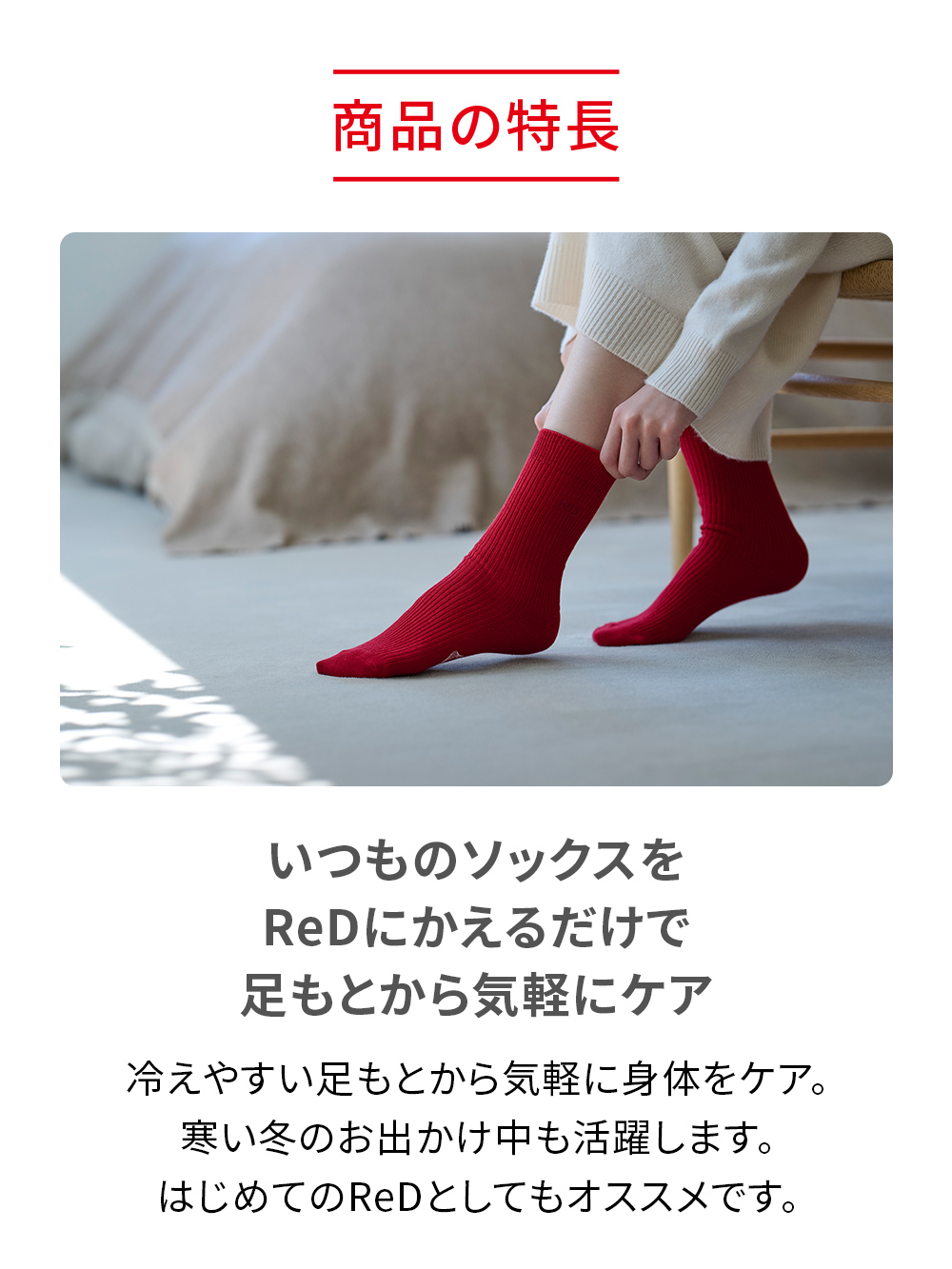 いつものソックスをReDにかえるだけで足もとから温かく。