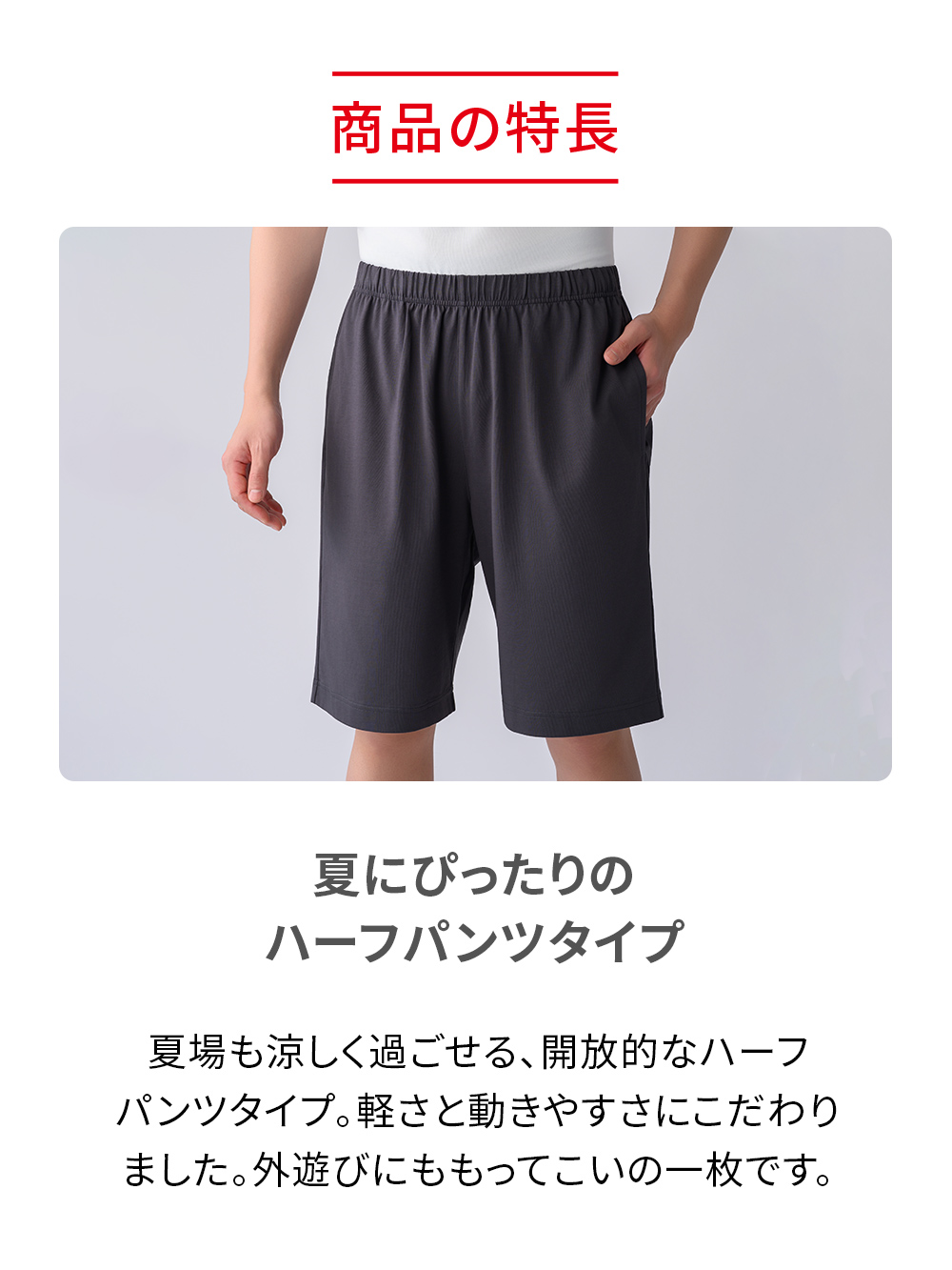 夏場も涼しく過ごせる、開放的なハーフパンツタイプ。軽さと動きやすさにこだわりました。外遊びにももってこいの一枚です。