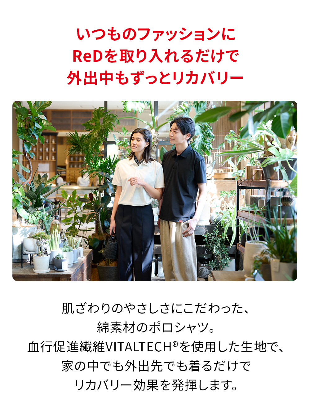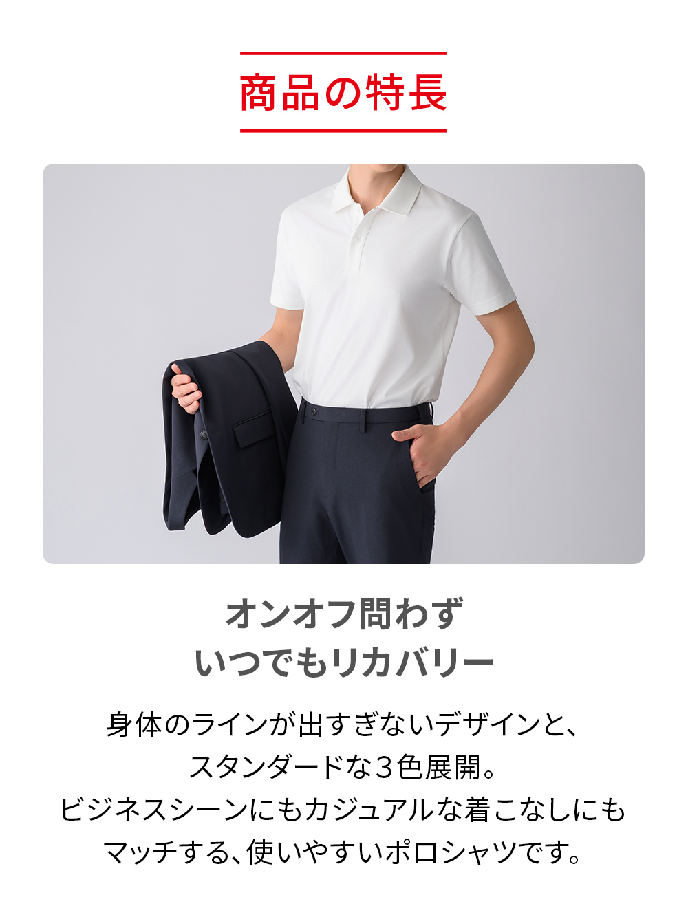 着るだけで遠赤外線の血行促進作用により、疲労回復や筋肉のハリ・コリの緩和などの効果が期待できる、リカバリーウェアの半袖ポロシャツです。