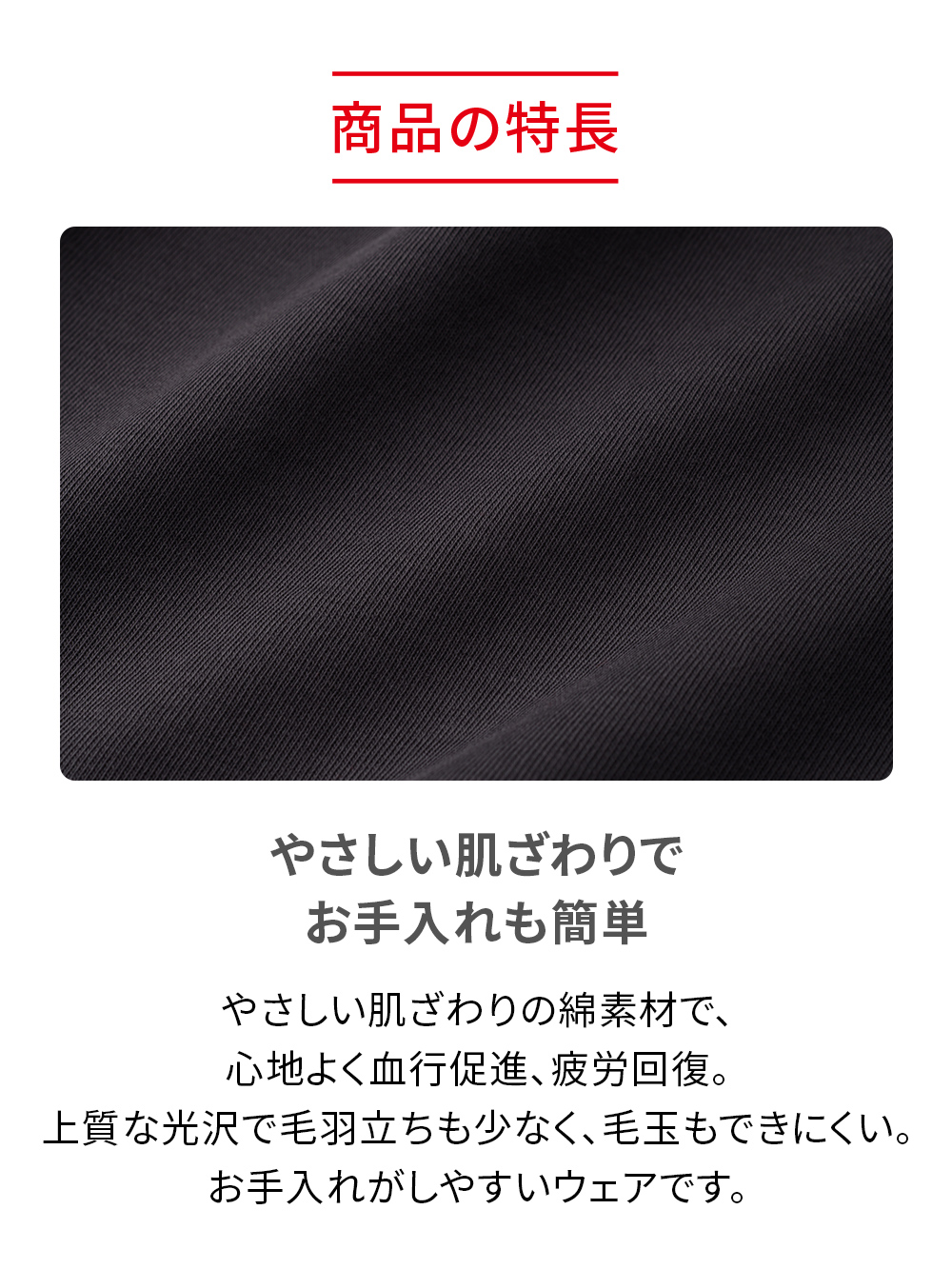 やさしい肌ざわりの綿素材で、心地よく血行促進、疲労回復。上質な光沢で毛羽立ちも少なく、毛玉もできにくい。お手入れがしやすいウェアです。