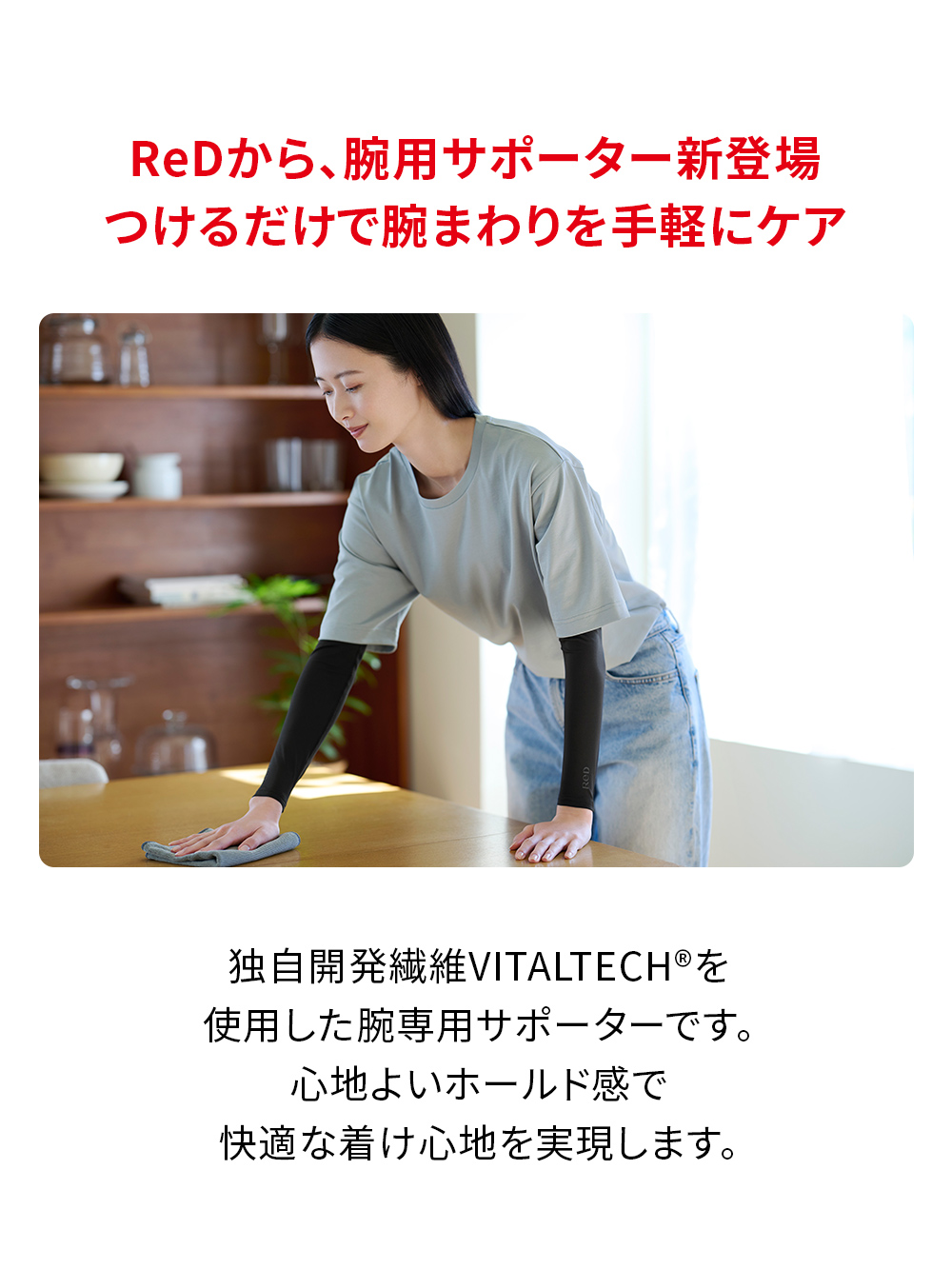 8つの天然鉱石を原料とした高純度セラミックを繊維に練りこんだ独自の特殊繊維VITALTECHを使用した腕用のサポーターです。 腕全体をやさしく包み込む仕様となっており、外出時や家事など、日常動作で感じる腕の負担をケアしてくれます。