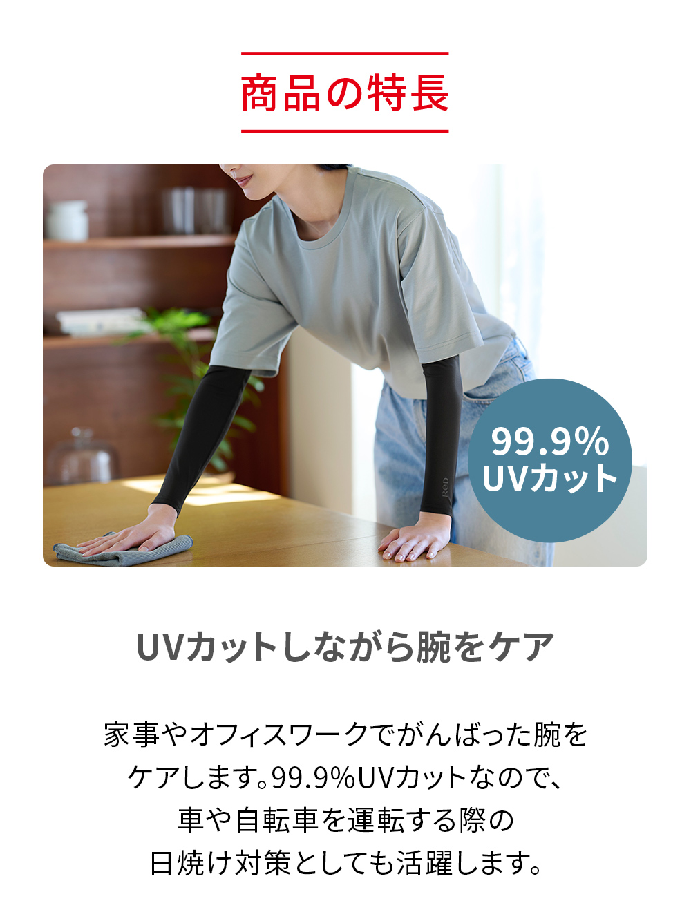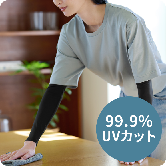 家事やオフィスワークでがんばった腕をケアします。99.9%UVカットなので、車や自転車を運転する際の日焼け対策としても活躍します。