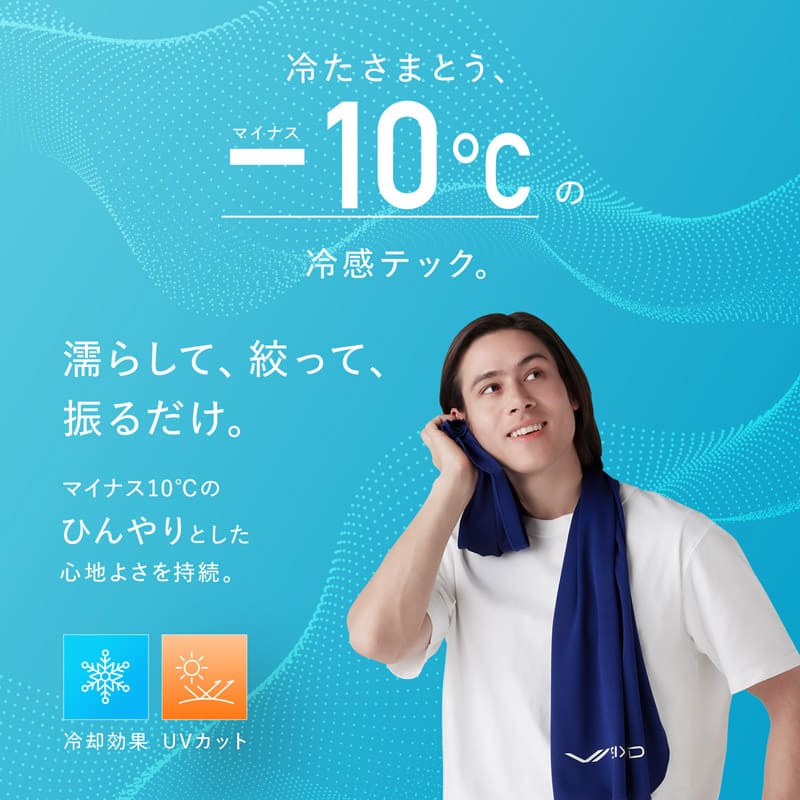 水分が蒸発するときに周囲の熱を奪う“気化熱”という現象を利用。濡らした製品を振ることで生地に含まれた水分が蒸発し、まわりの熱を奪うことで冷却効果を発揮します。