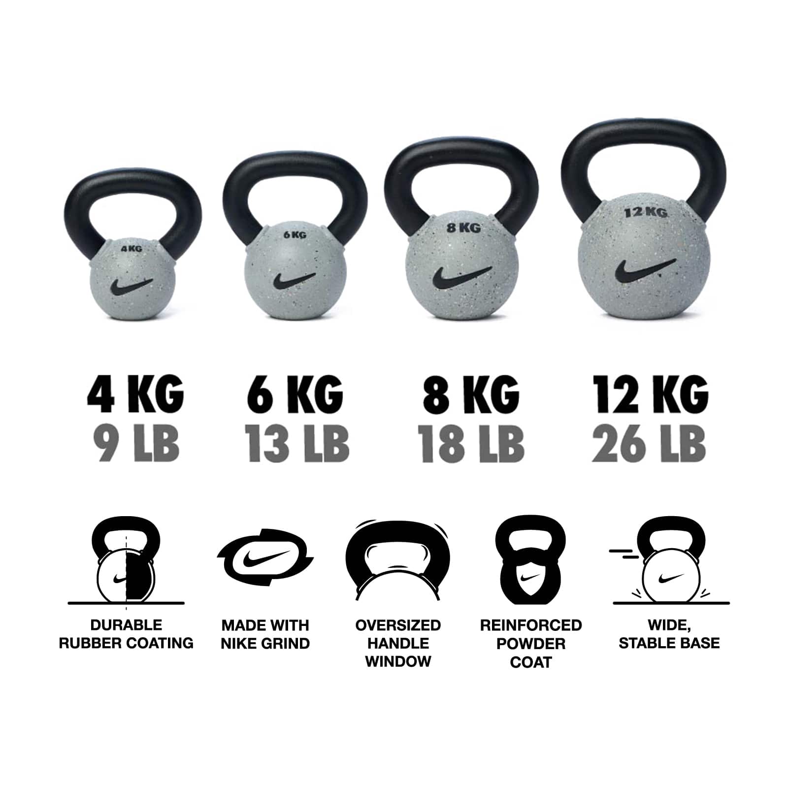 ※ラバーコーティングケトルベルのNike Grindカラーは「スモークグレー」で、Nike Grindダンベルの「ウルフグレー」よりも若干濃い色です。スモークグレーのベースカラーはケトルベルによって若干異なる場合があります。