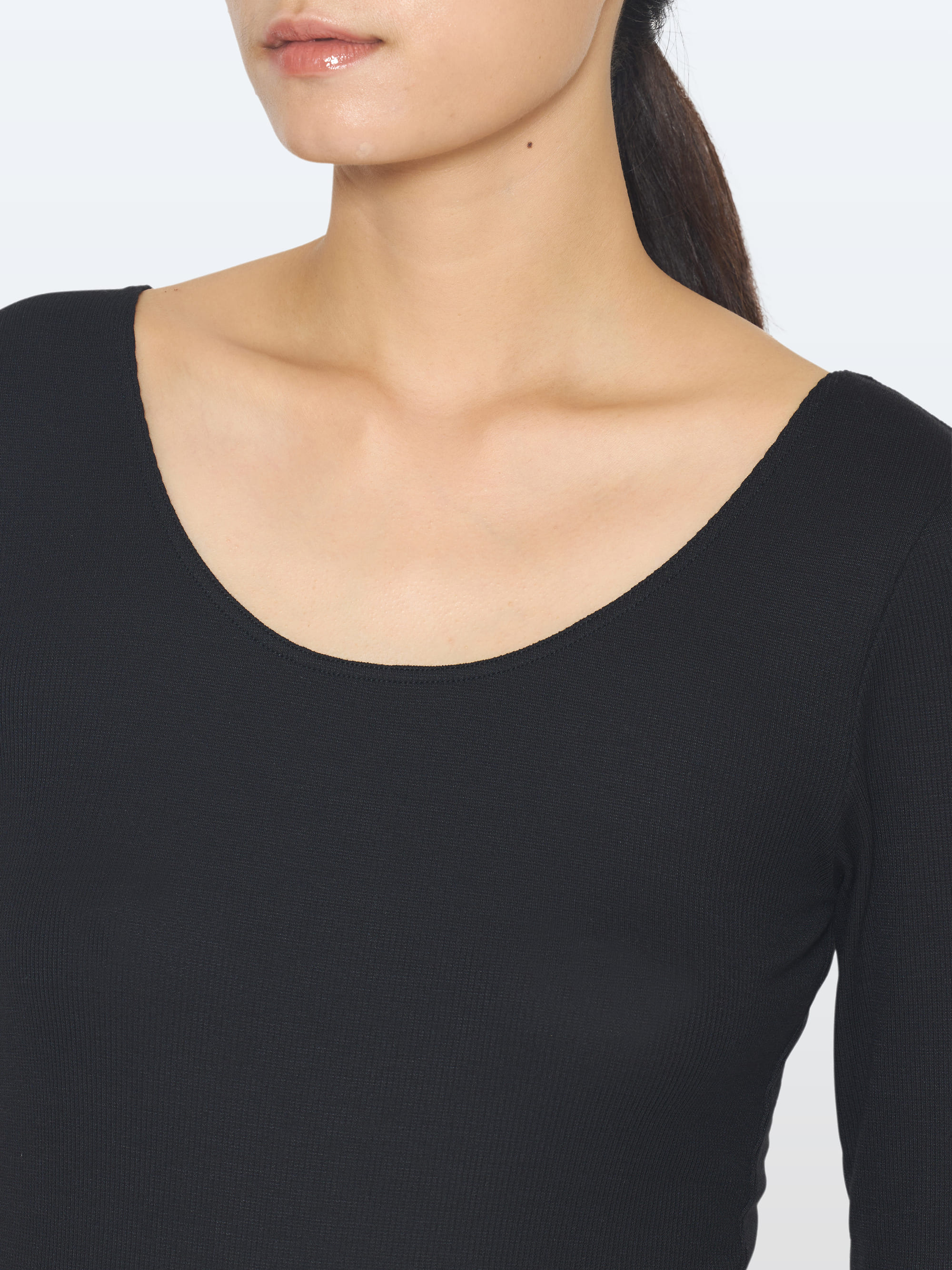 首回りを美しく見せる深めのラウンドネック。背面も適度にあけていて、アウターにもひびきにくい。