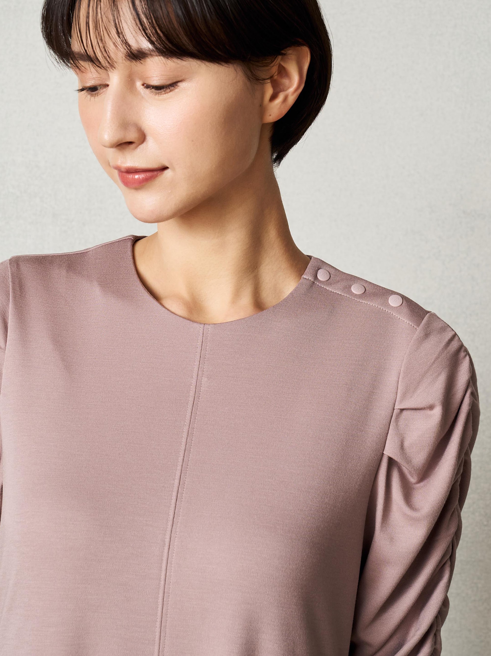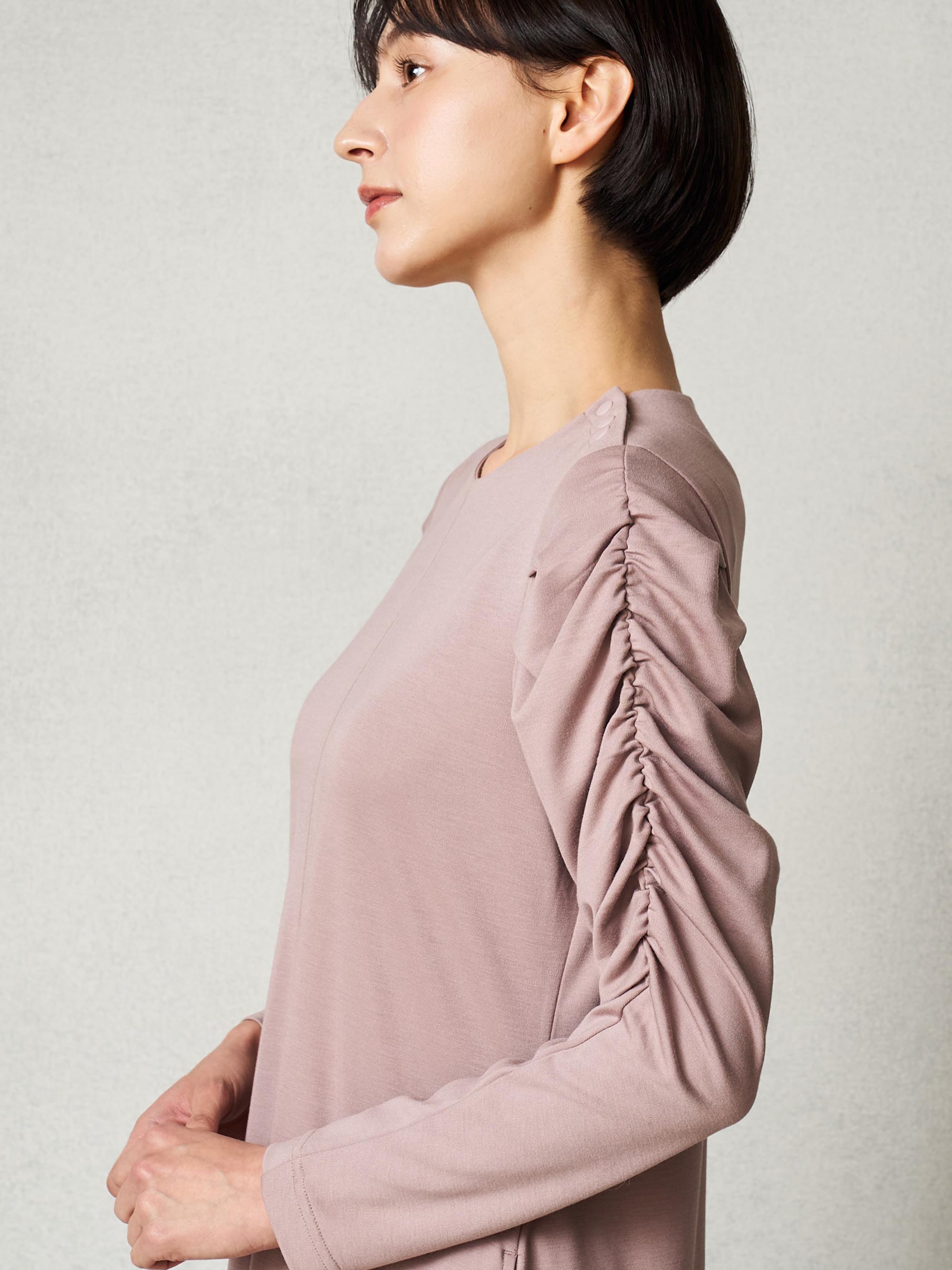 二の腕にギャザーを施し、布量を多くして血行促進。脂肪が多く冷えやすい二の腕にアプローチ。