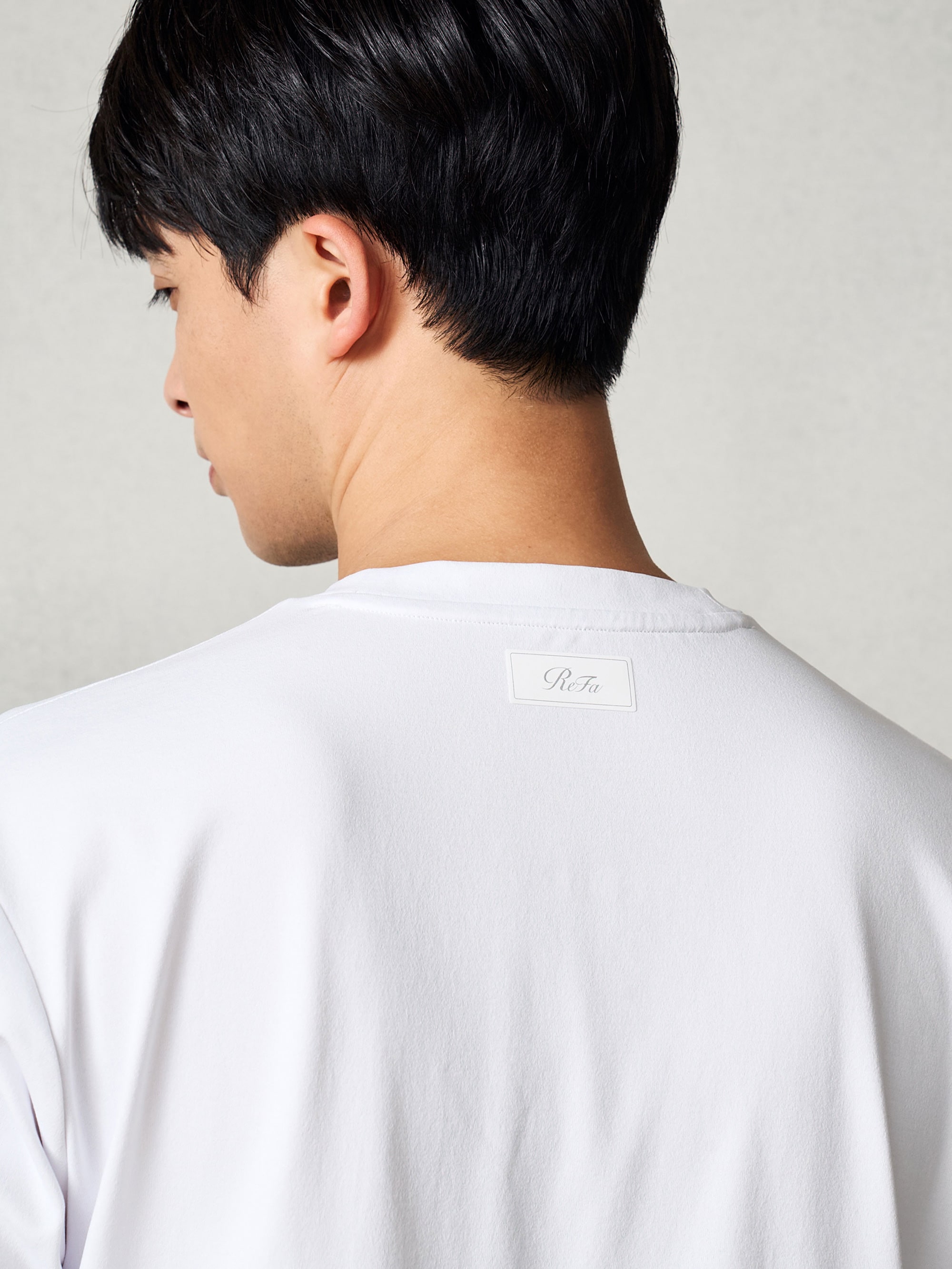 背面にブランドタグを配置。内側に縫い目が無いため、着ていても気にならない。