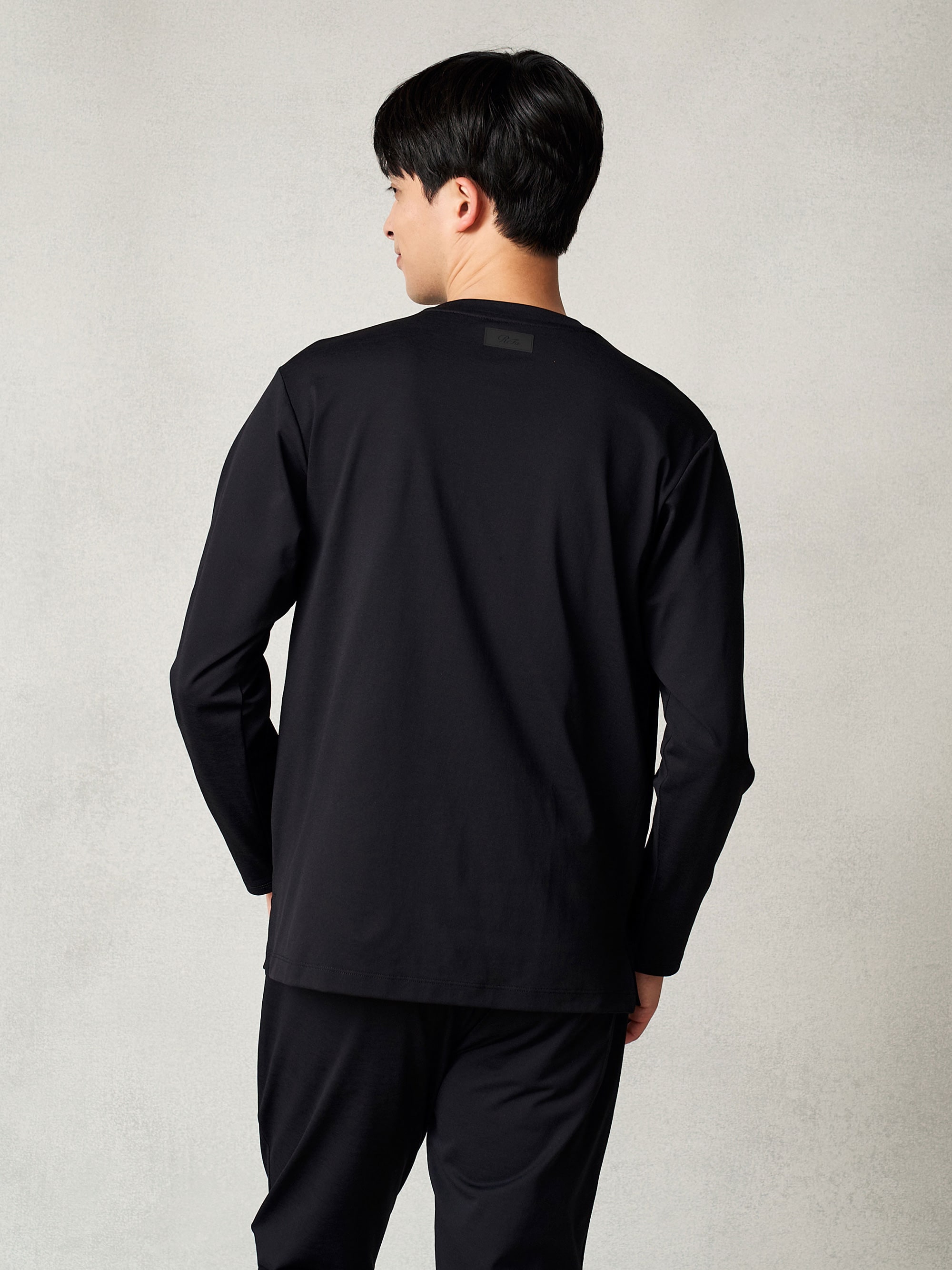 背面にブランドタグを配置。内側に縫い目が無いため、着ていても気にならない。
