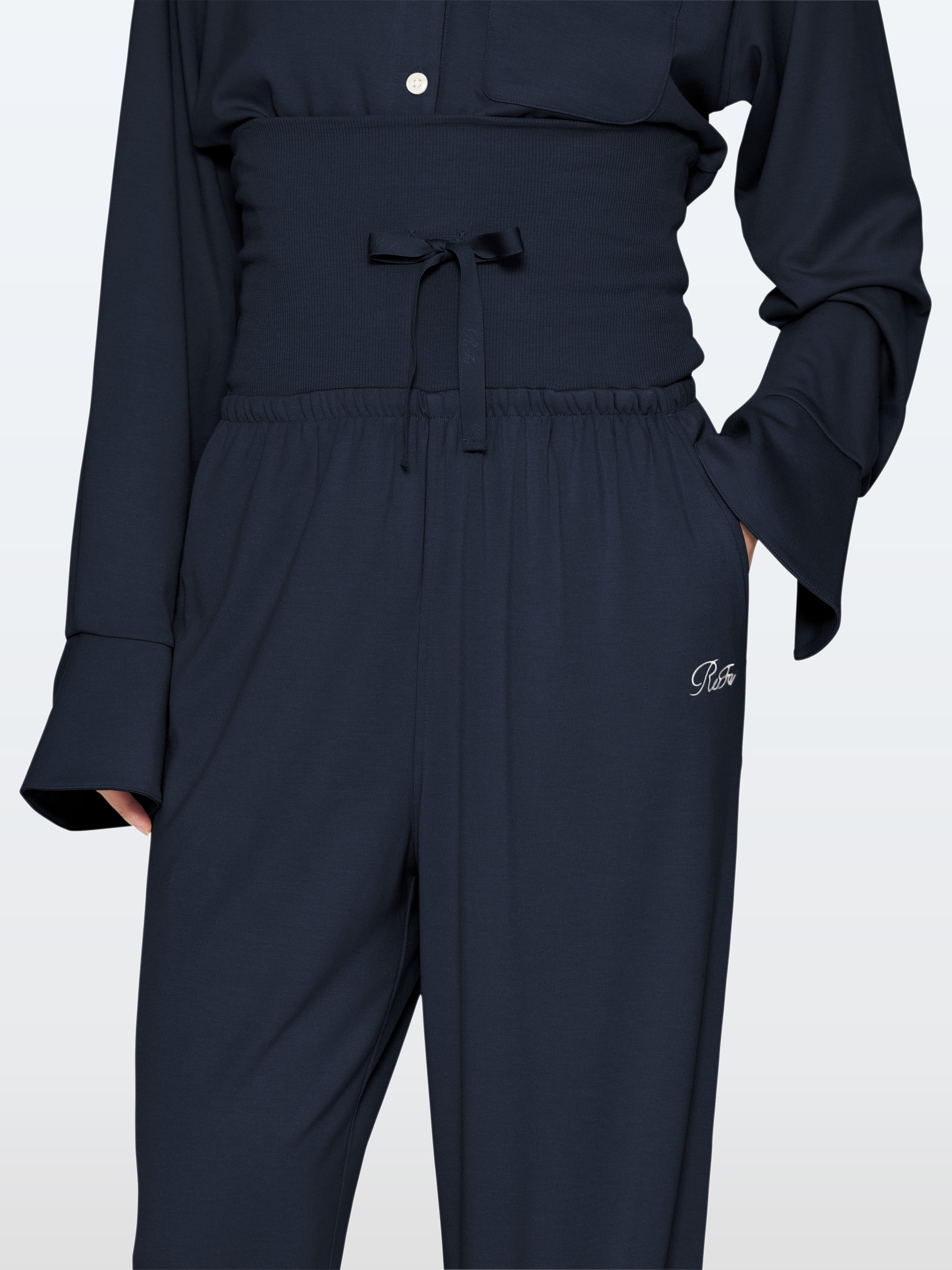 ボタン、ポケット部分、背当て部分、ウエスト部分のリボンなどにロゴを配置。