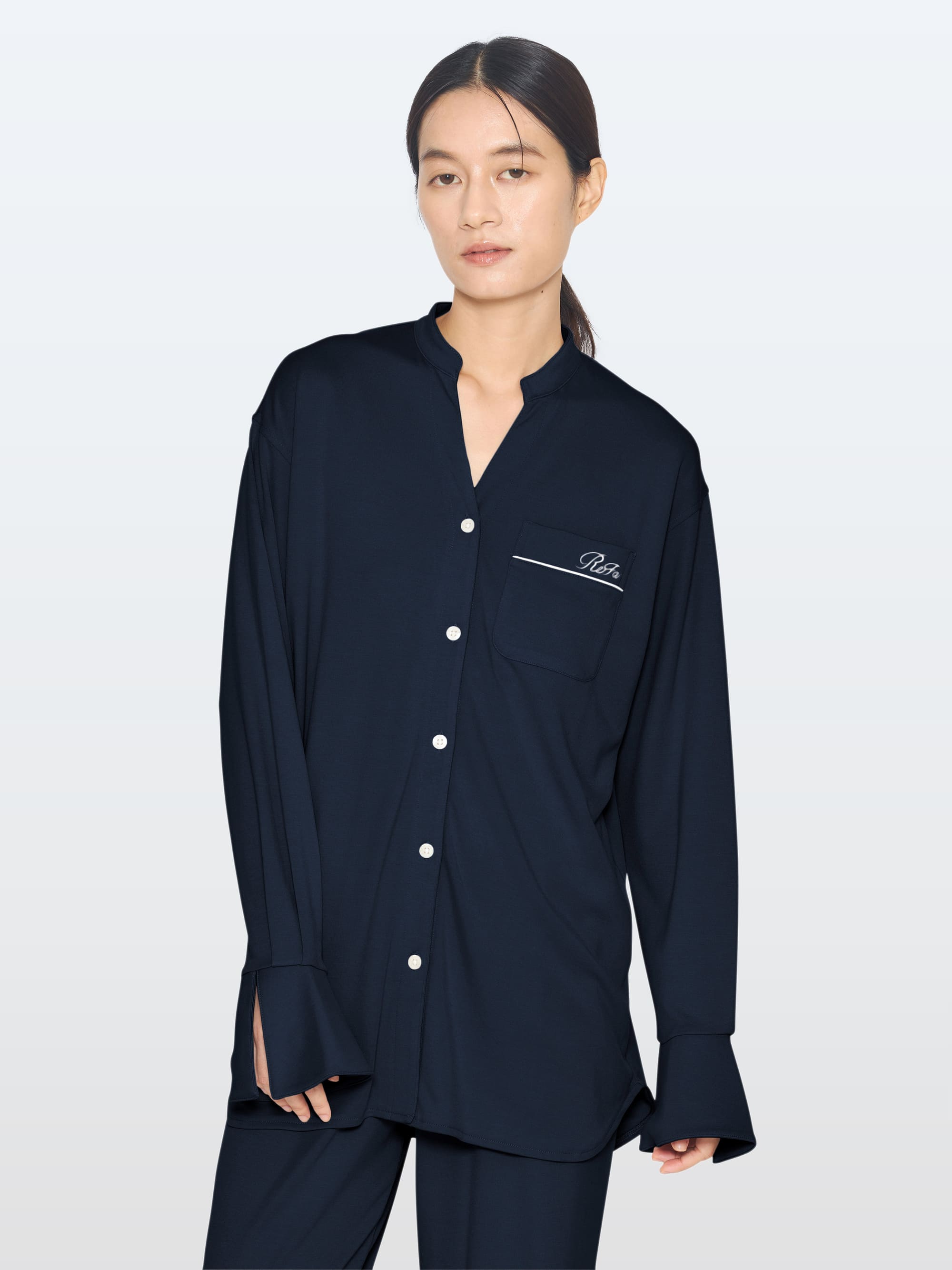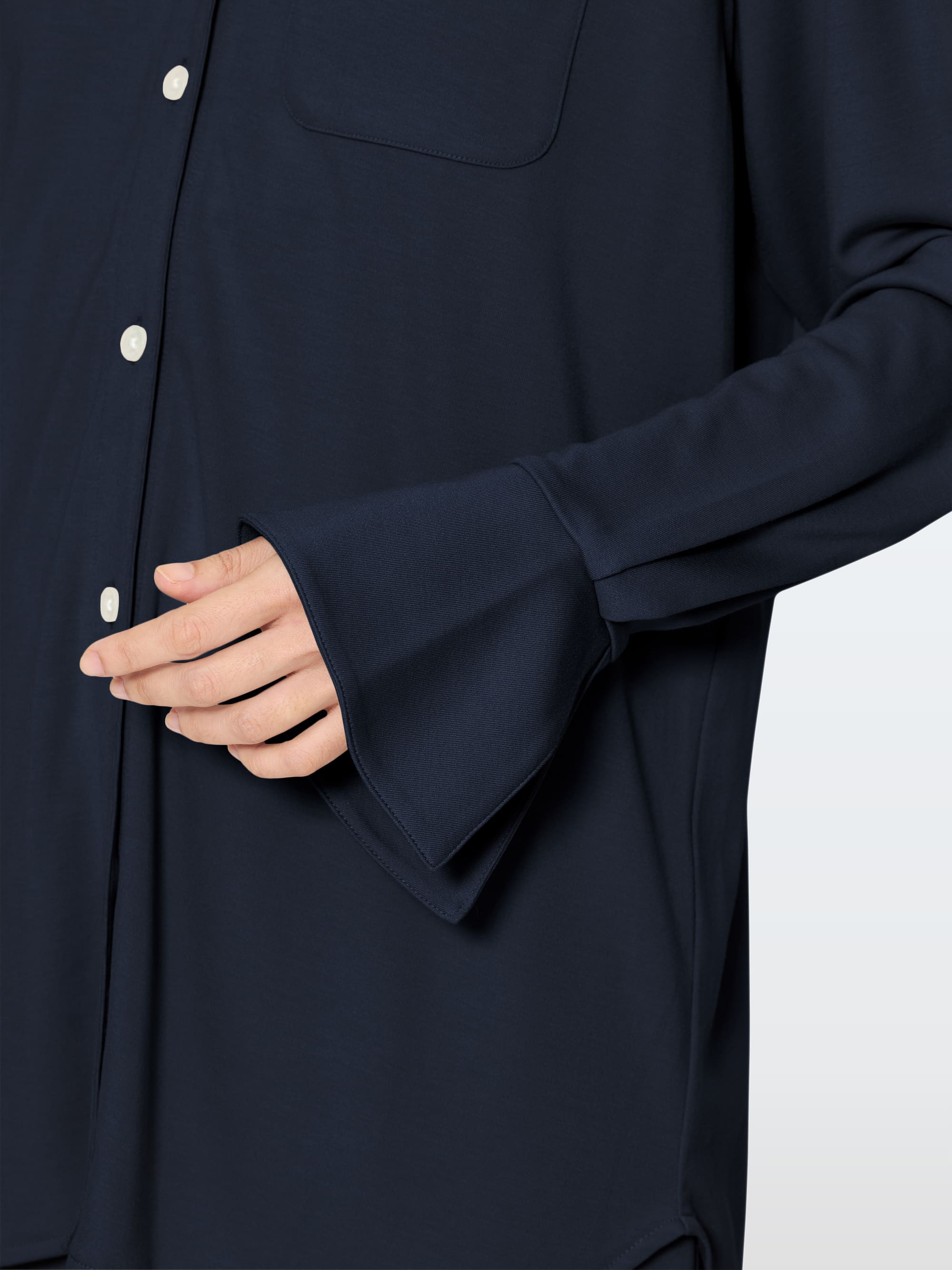 スタンドカラーの襟元。手の甲までかかる袖丈。ボトムの裾部分も2重に。