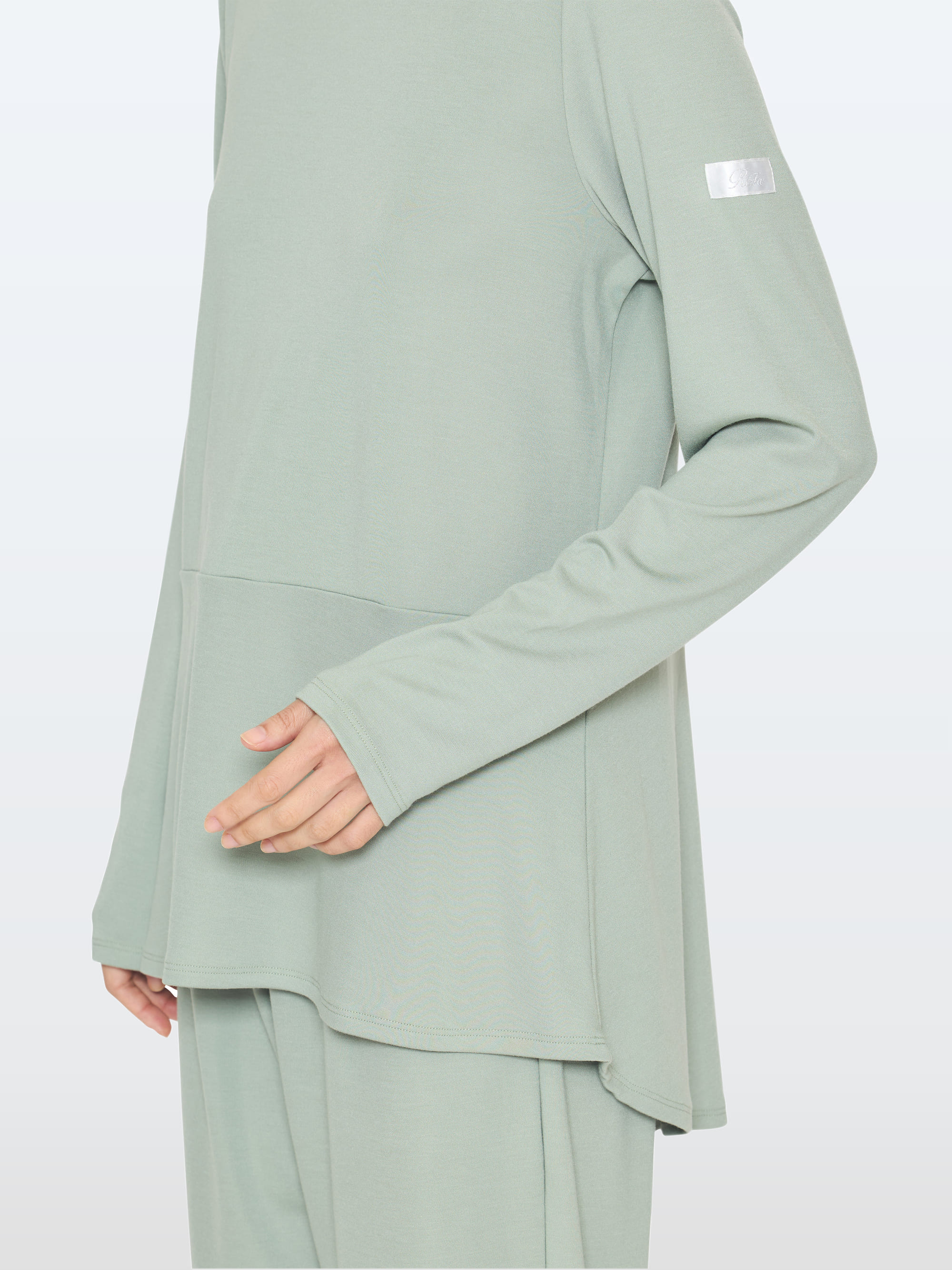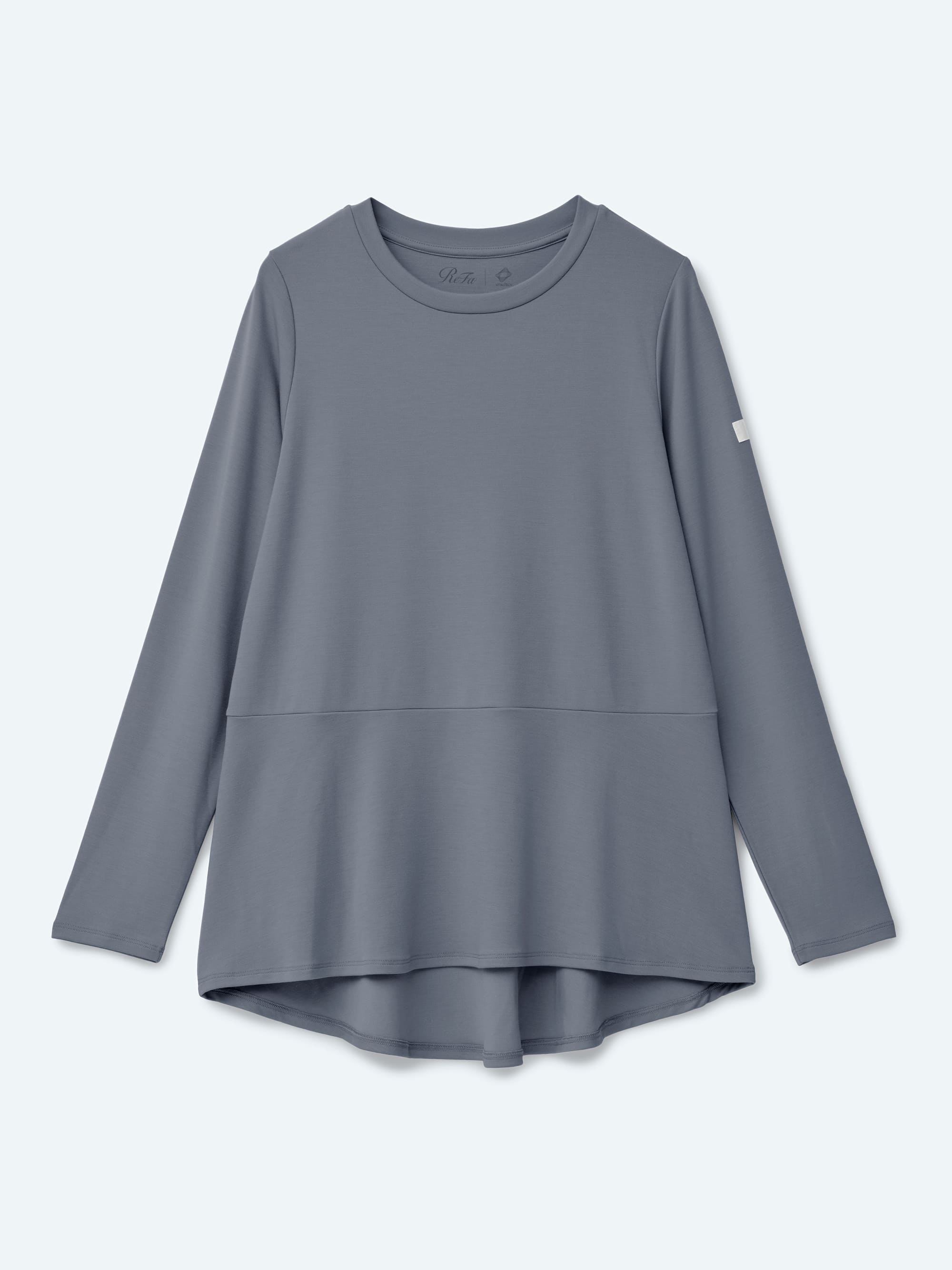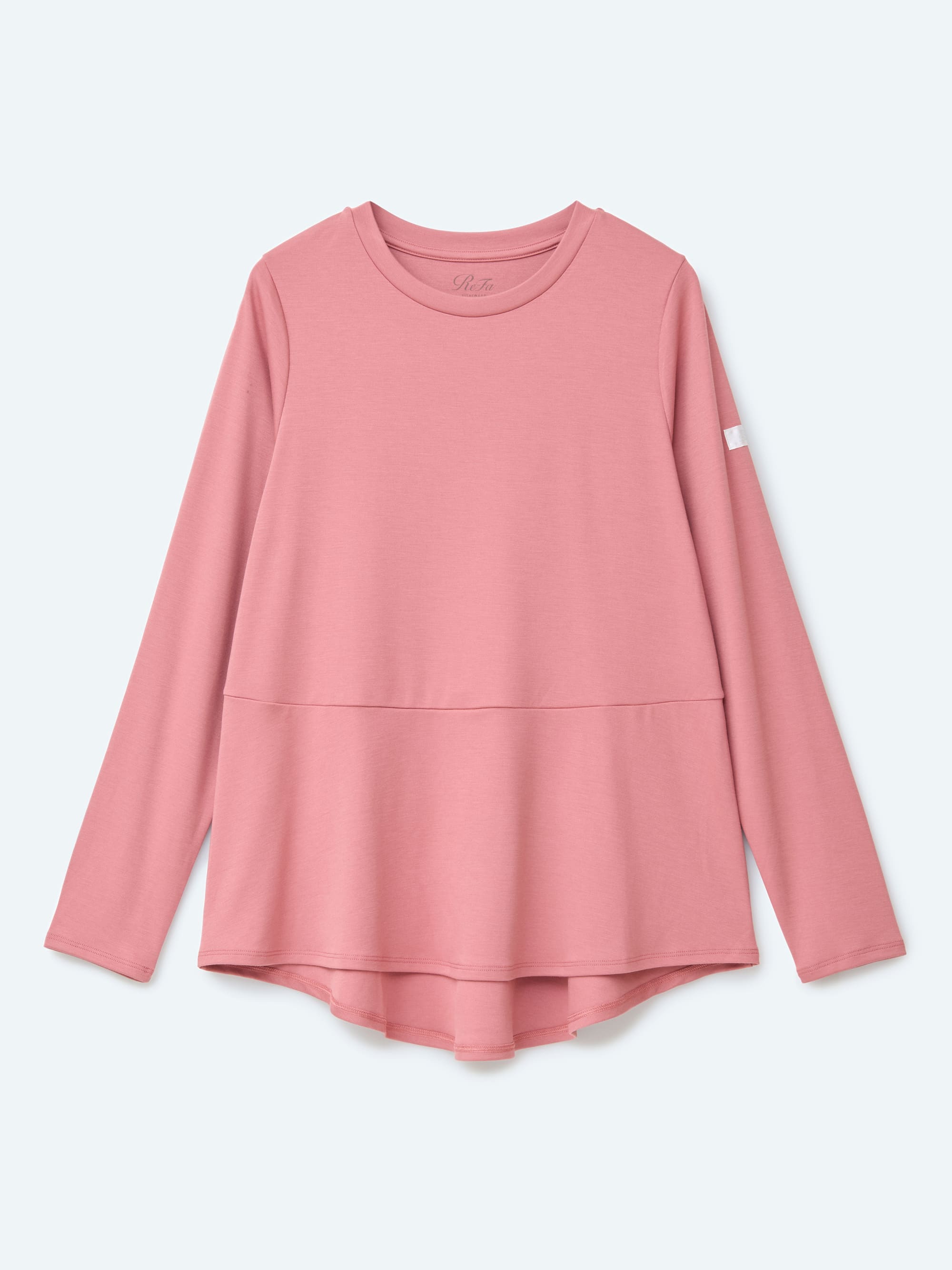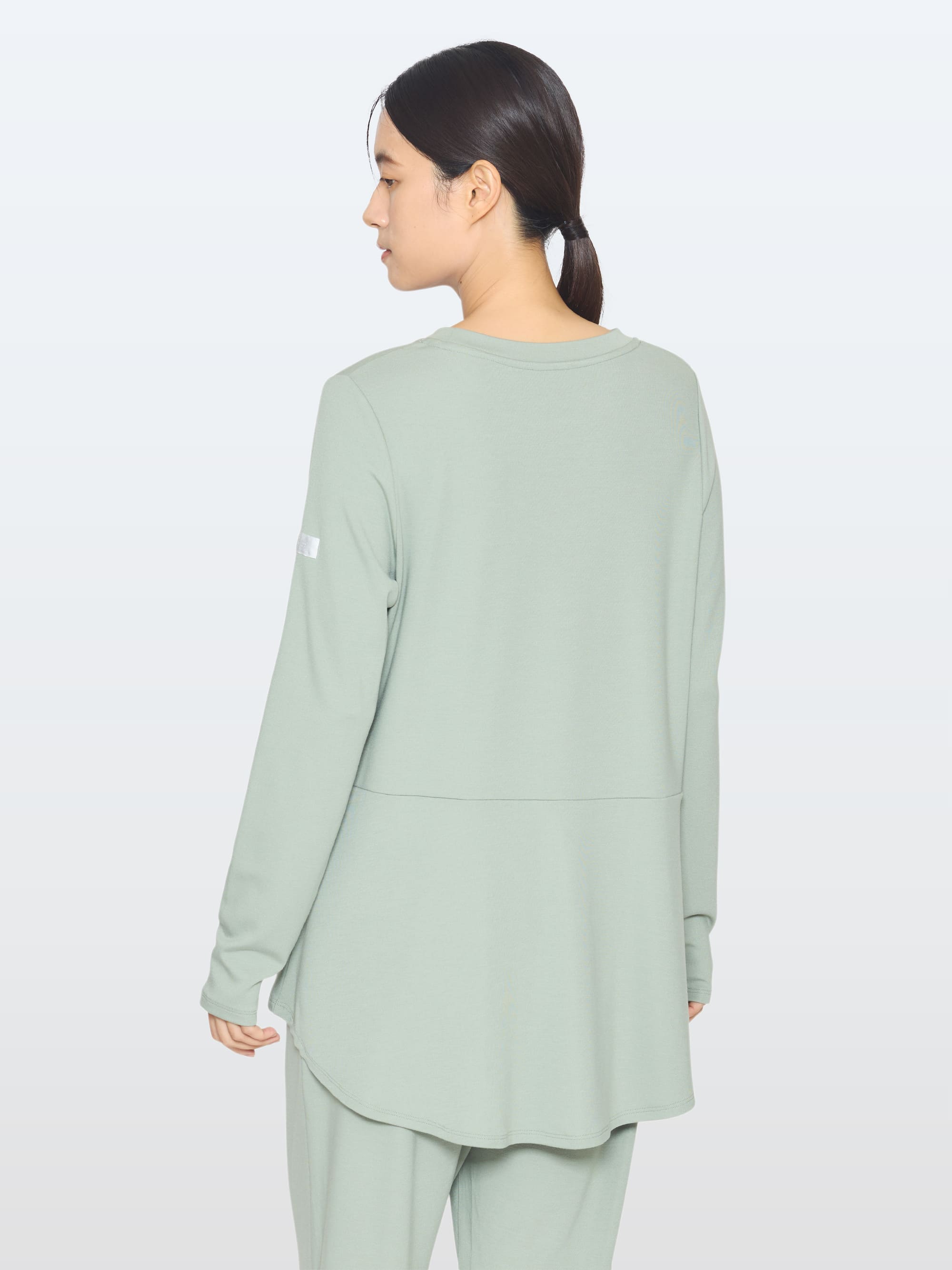 お尻をカバーする丈感。部屋で過ごす時間も快適で美しく見える。