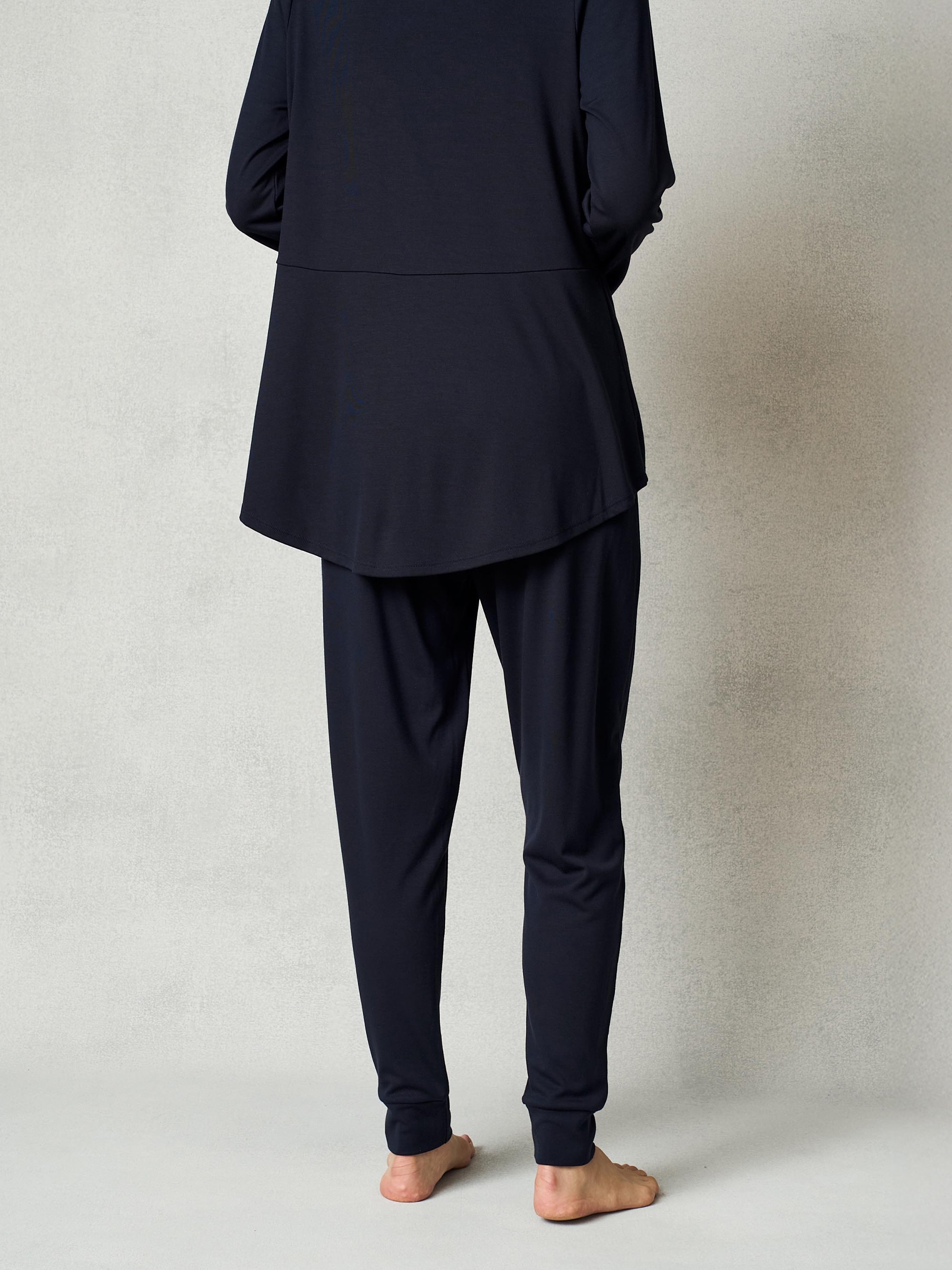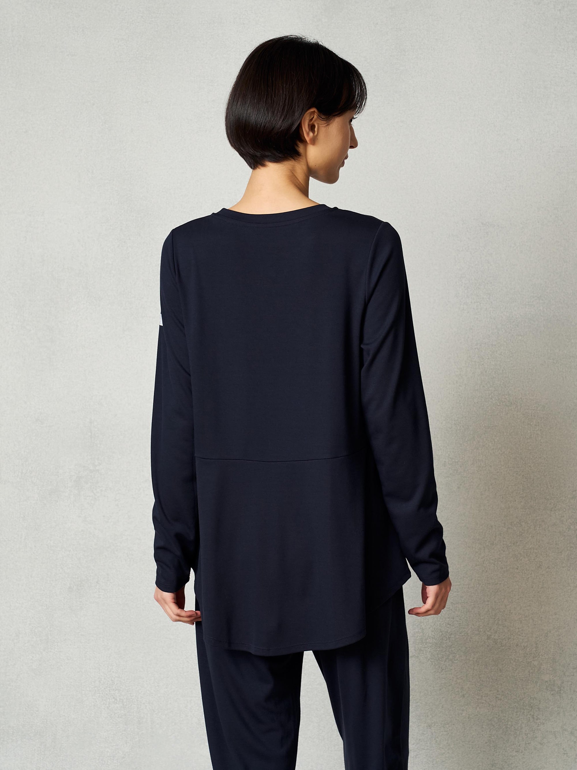 お尻をカバーする丈感。部屋で過ごす時間も快適で美しく見える。