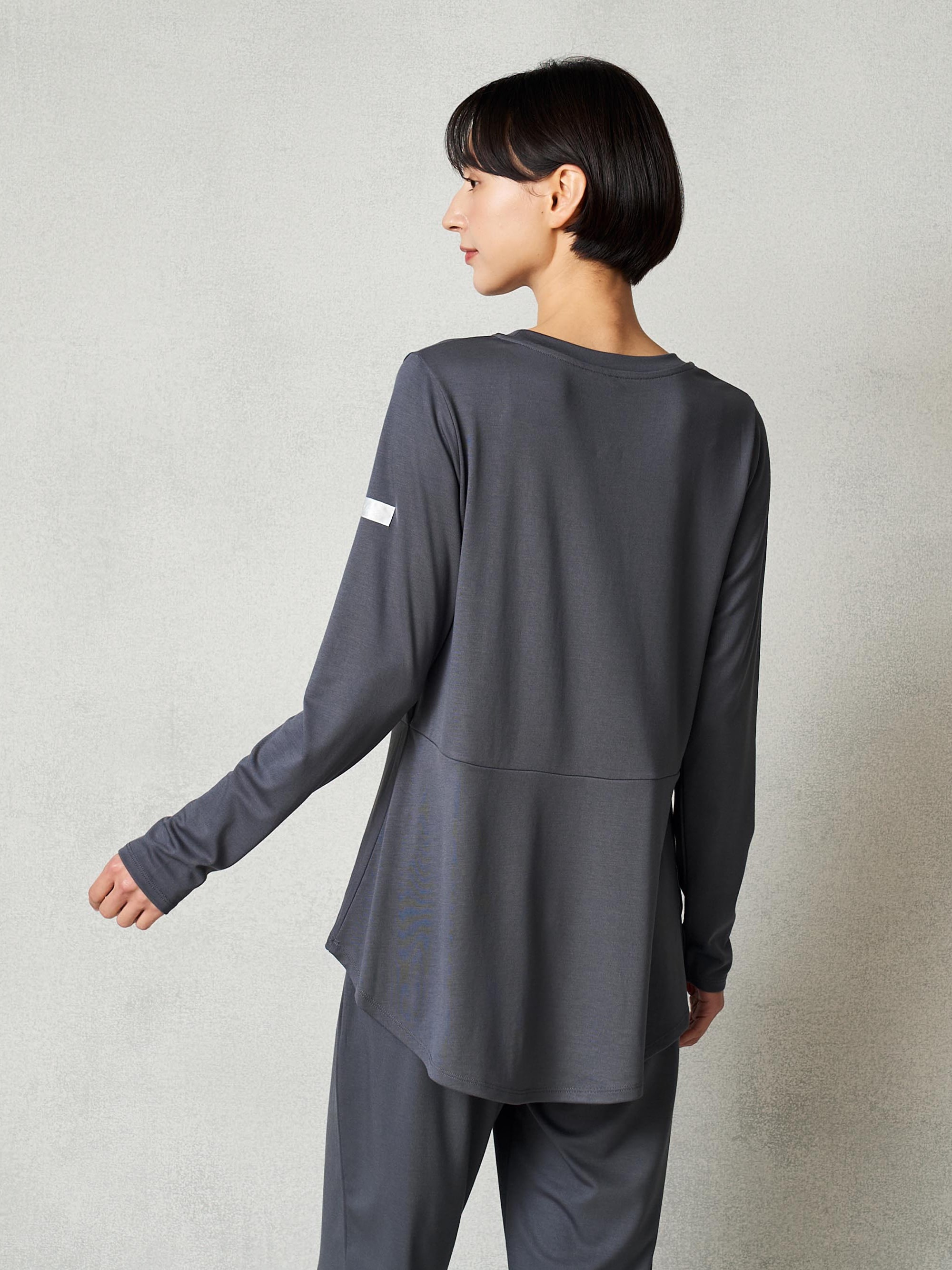 お尻をカバーする丈感。部屋で過ごす時間も快適で美しく見える。