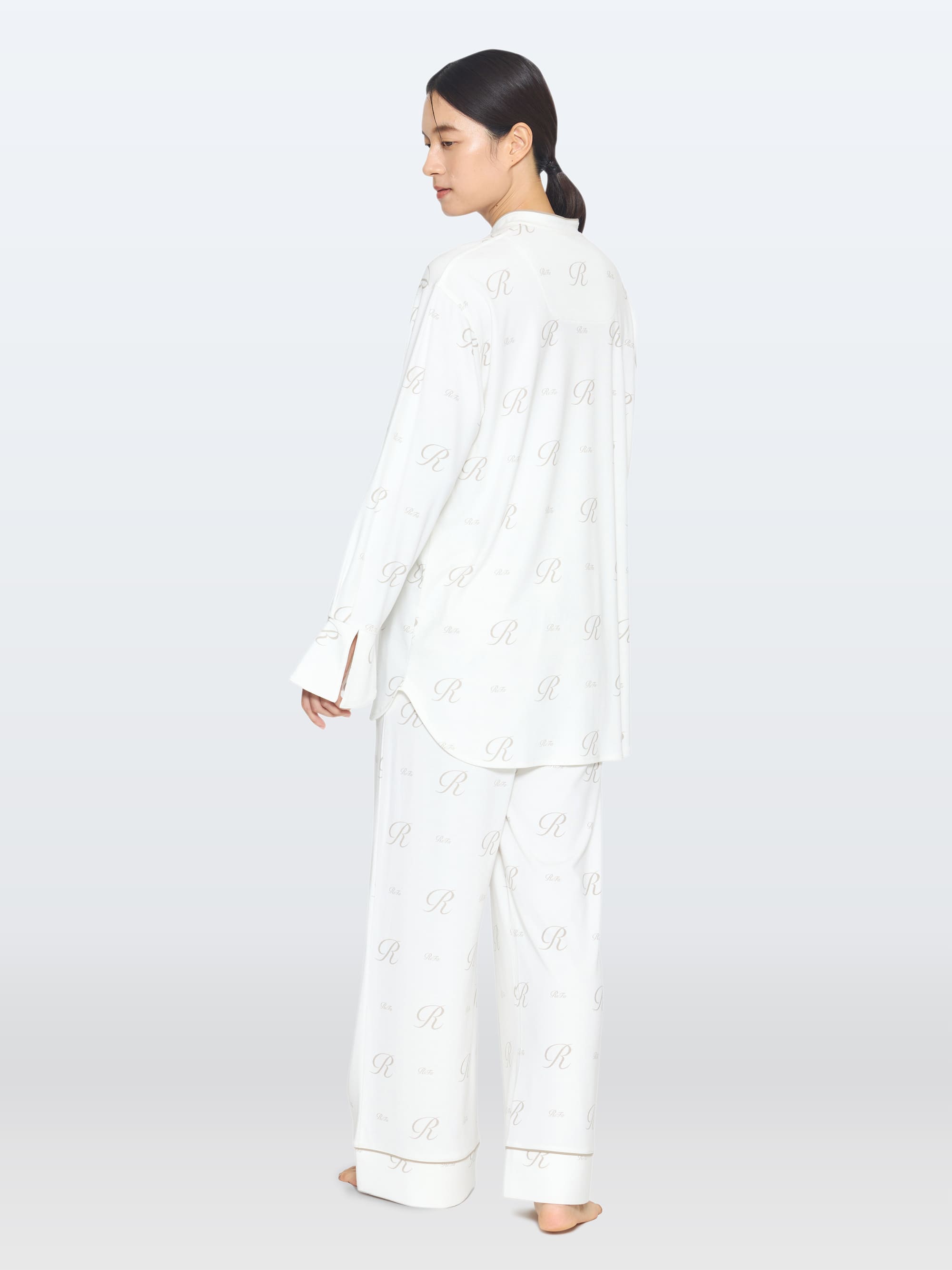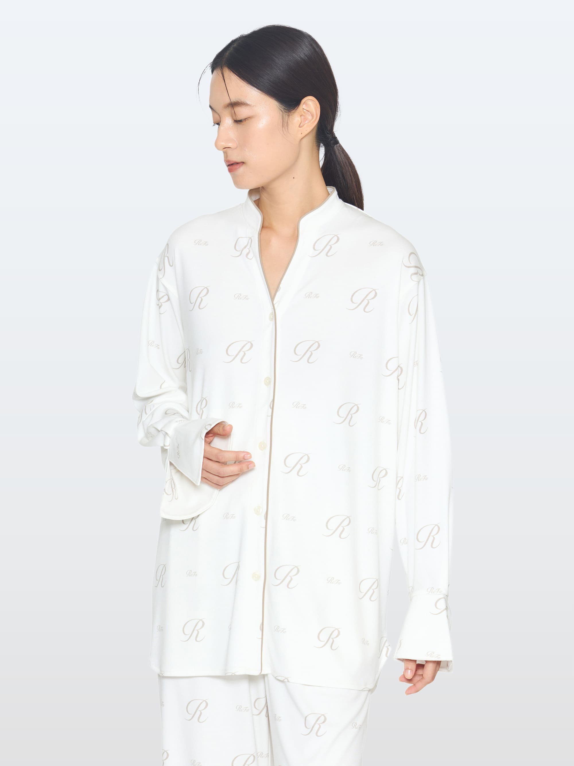 ボタン、ウエスト部分のリボンなどにロゴを配置して細部にもこだわったデザイン。