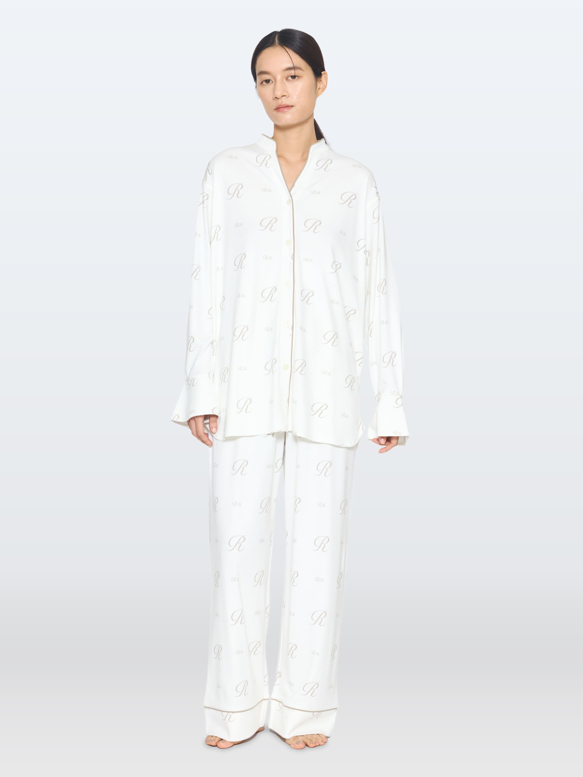 スタンドカラーの襟元。手の甲までかかる袖丈。ボトムの裾部分も2重に。