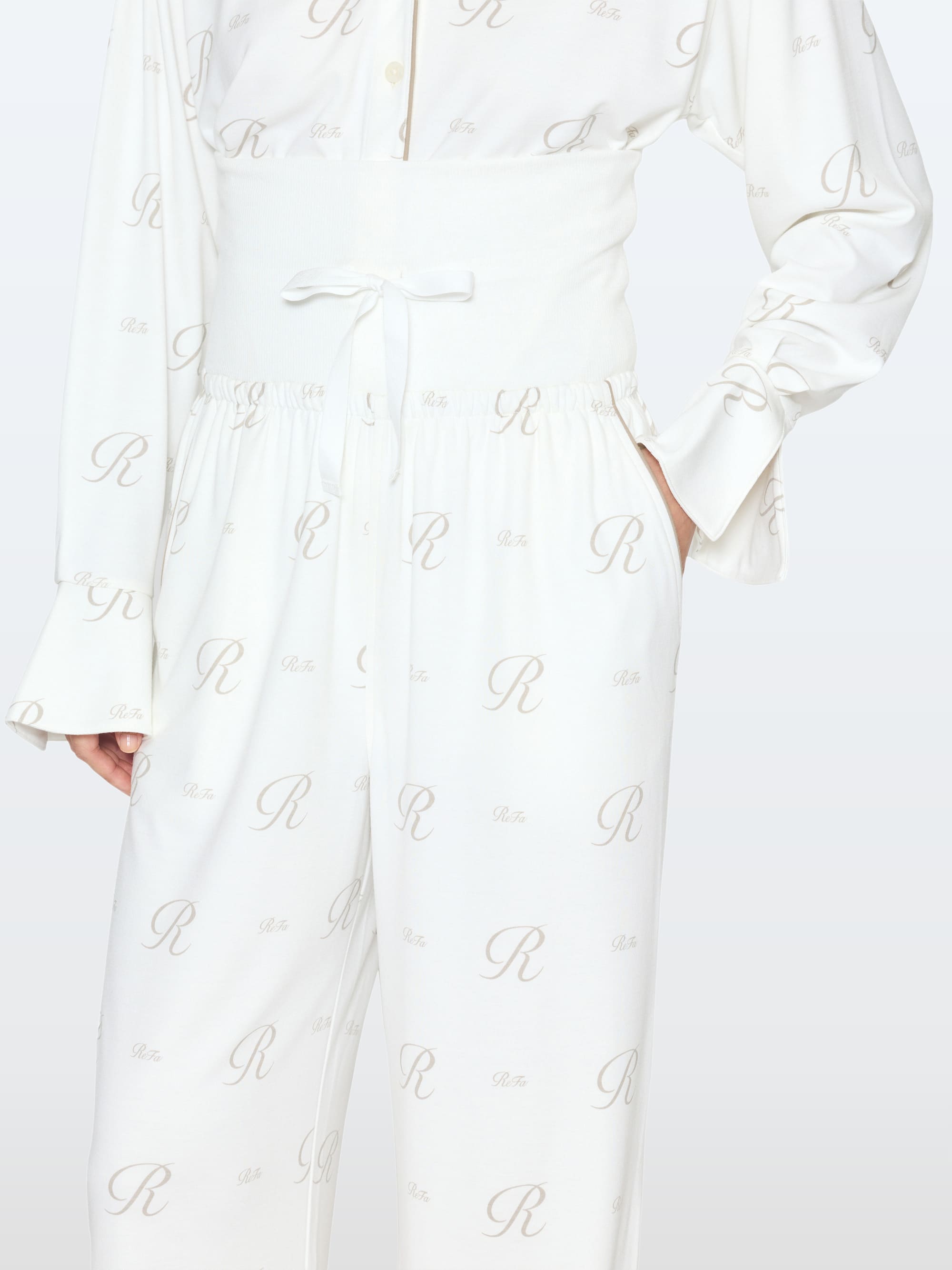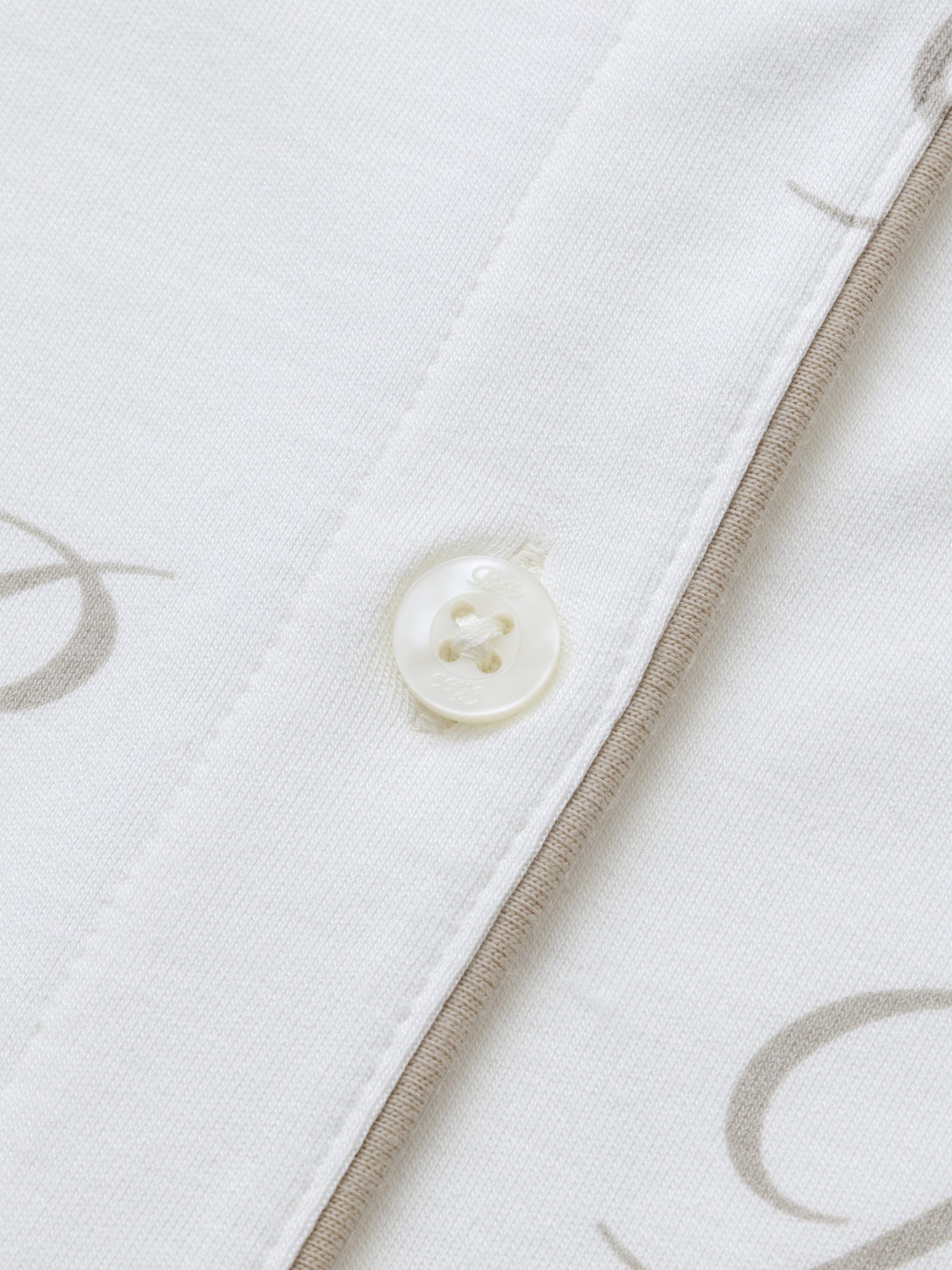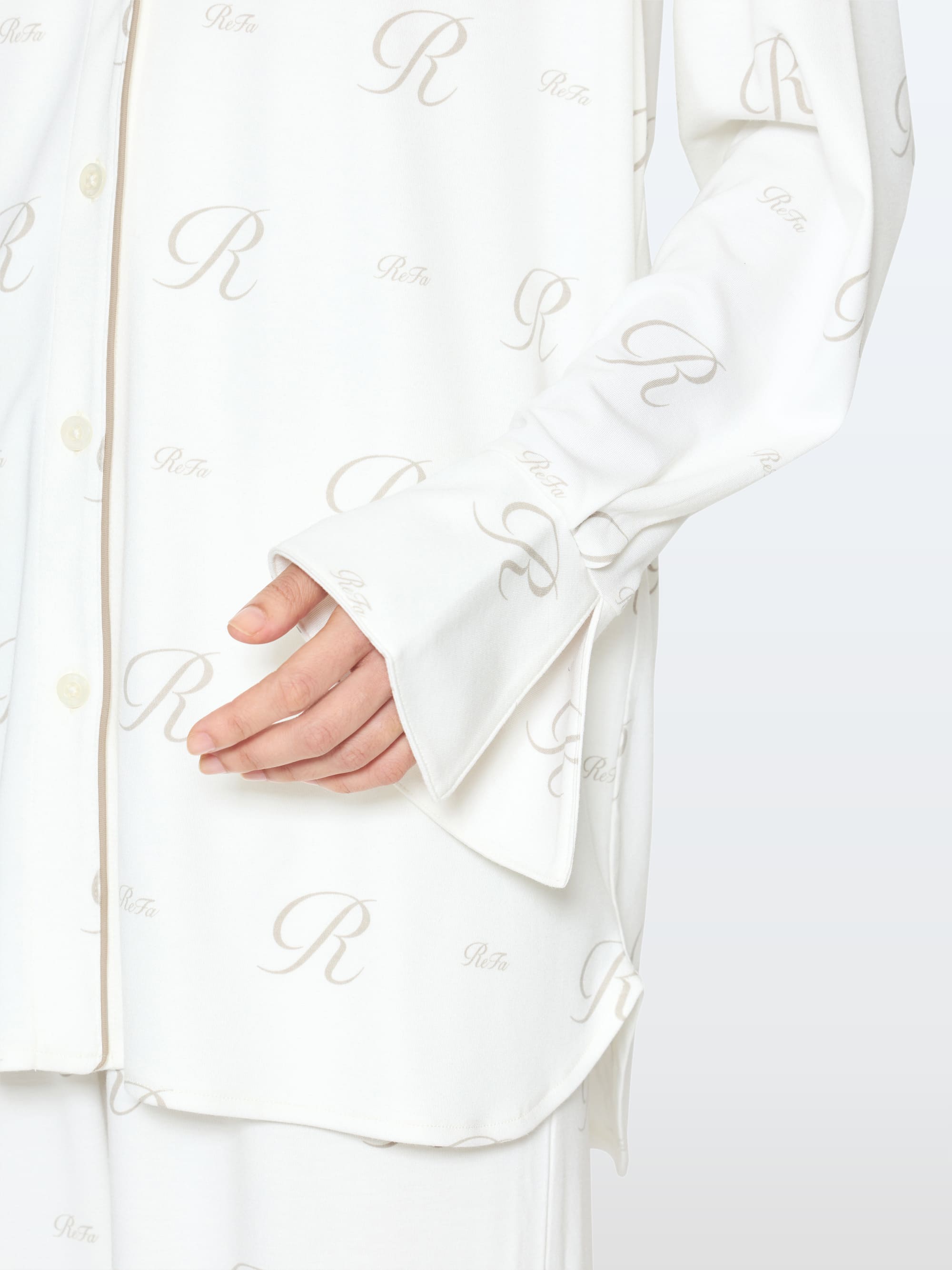 ボタン、ウエスト部分のリボンなどにロゴを配置して細部にもこだわったデザイン。