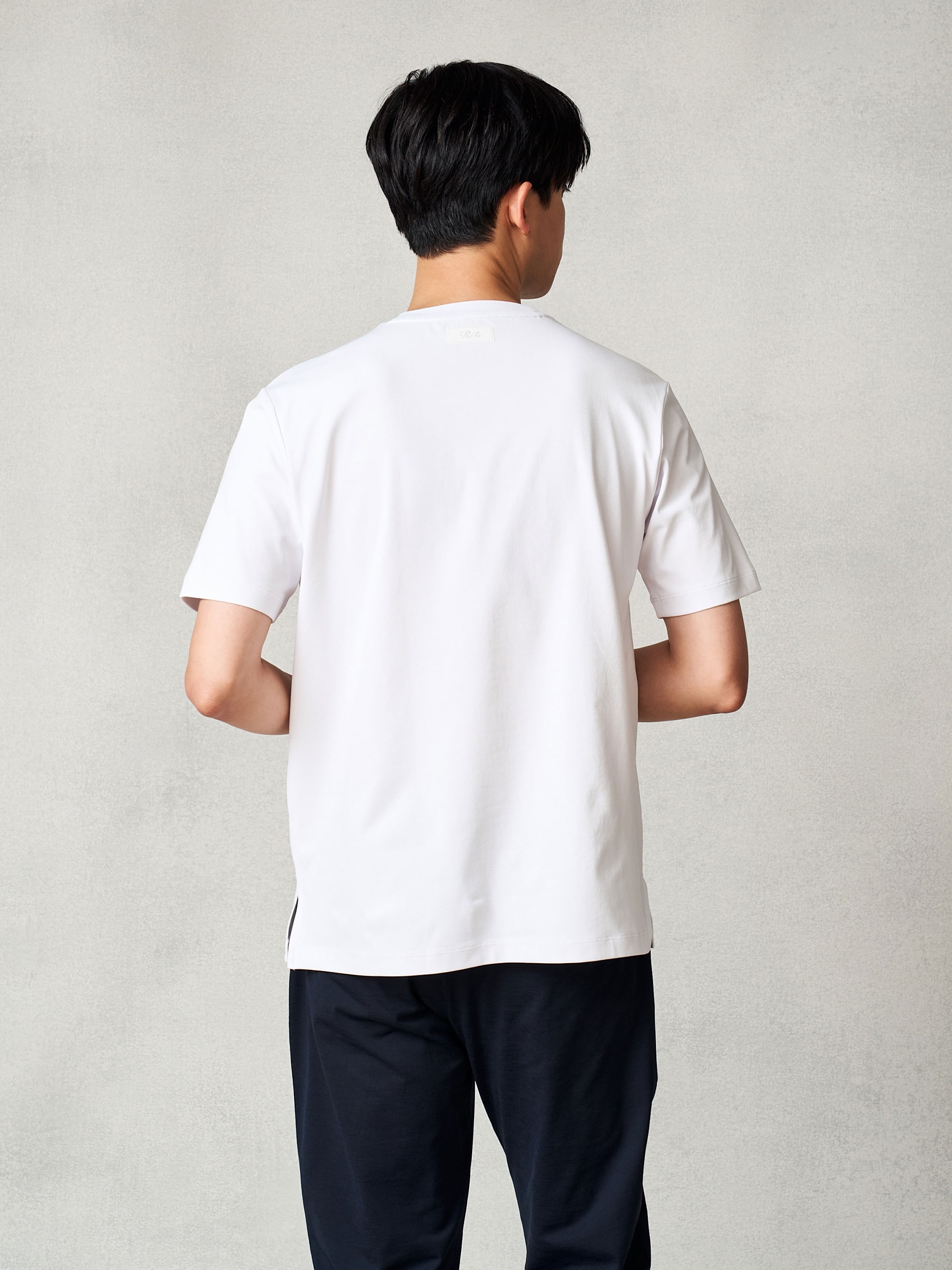 背面にブランドタグを配置。内側に縫い目が無いため、着ていても気にならない。