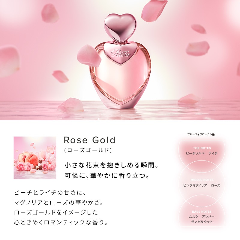 ピーチとライチの甘さに、マグノリアとローズの華やかさ。ローズゴールドをイメージした心ときめくロマンティックな香り。
