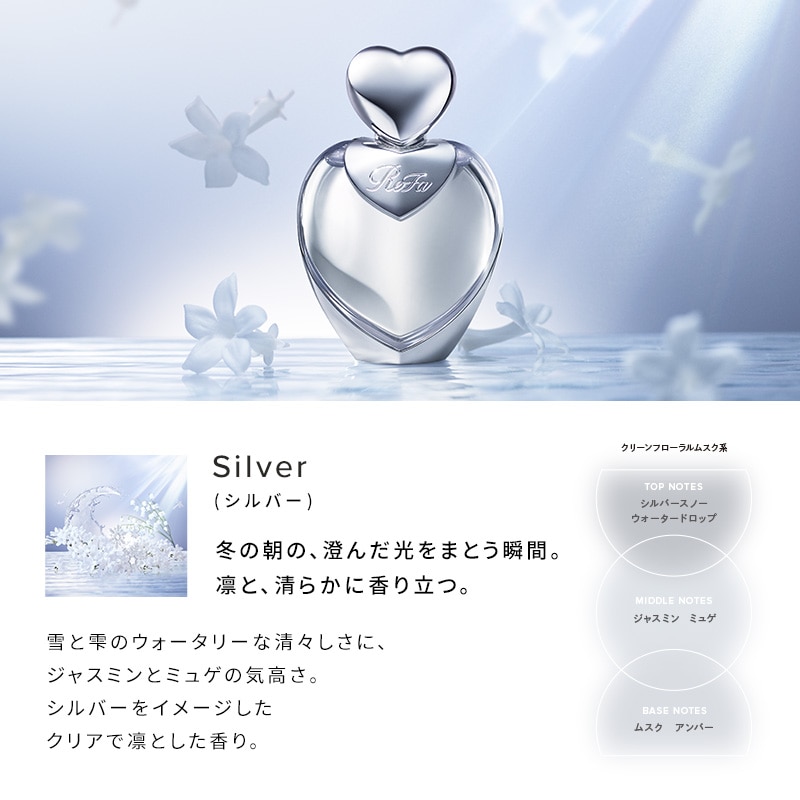 雪と雫のウォータリーな清々しさに、ジャスミンとミュゲの気高さ。シルバーをイメージしたクリアで凛とした香り。