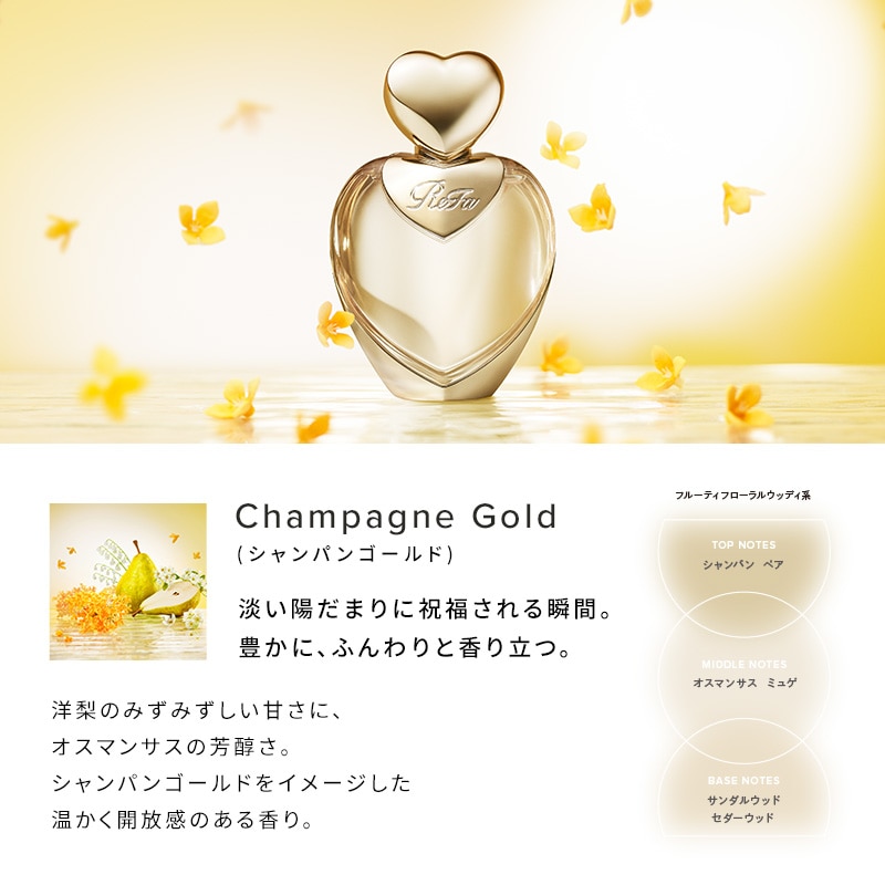 洋梨のみずみずしい甘さに、オスマンサスの芳醇さ。シャンパンゴールドをイメージした温かく開放感のある香り。