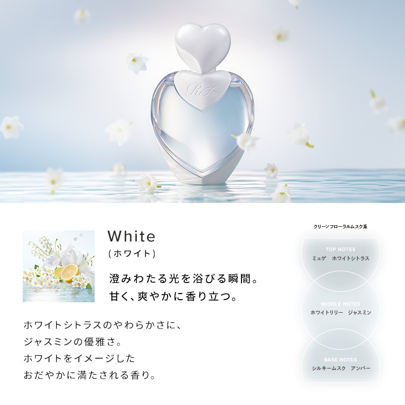 ホワイトシトラスのやわらかさに、ジャスミンの優雅さ。ホワイトをイメージした、おだやかに満たされる香り。
