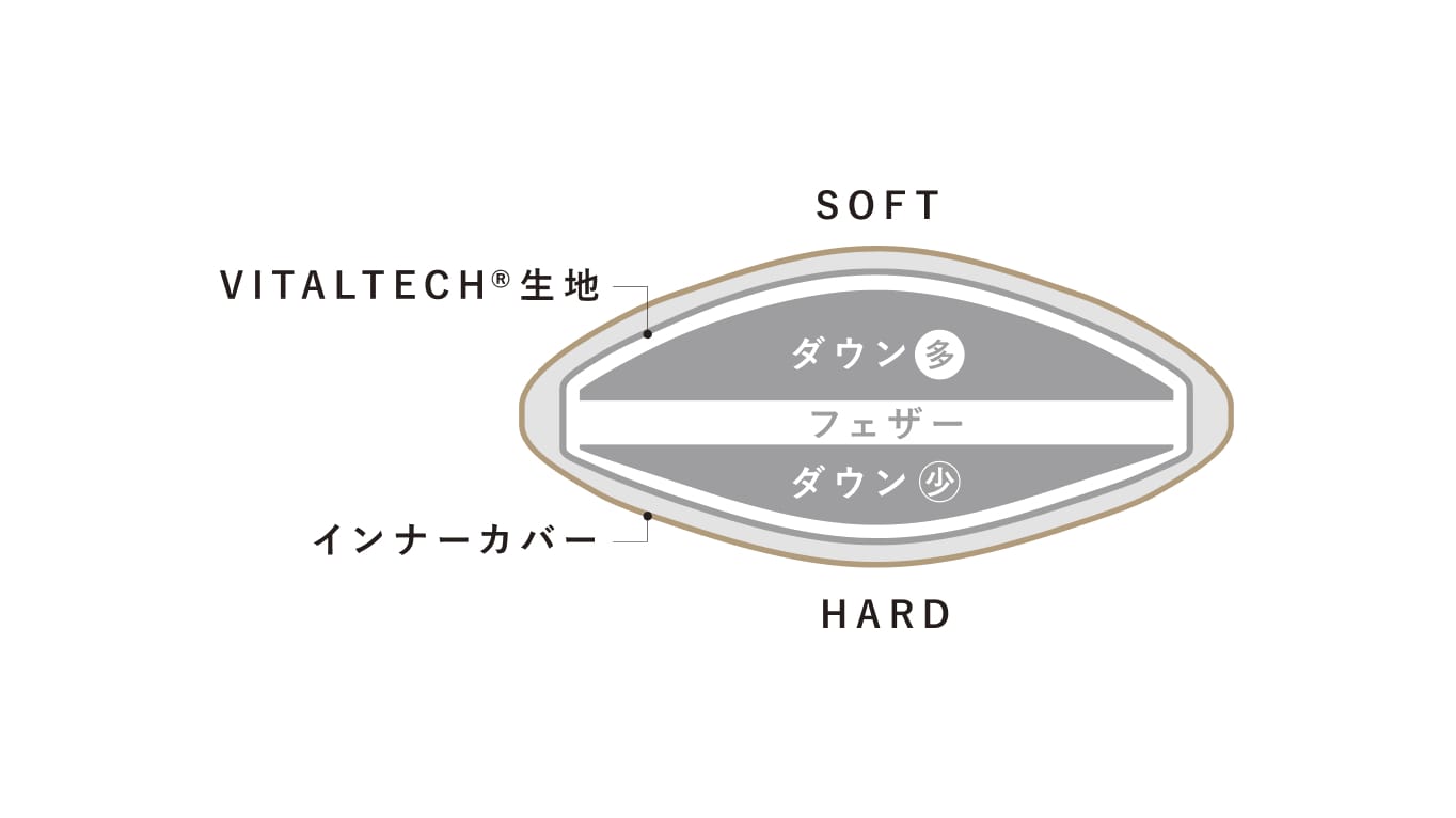 SOFT面はたっぷりのダウンで極上のふわふわを、HARD面は柔らかくもしっかりと支え、2つの魅力を両立。
