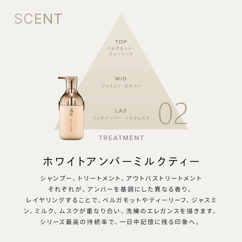 リファミルクプロテインロイヤルラインはレイヤリングで洗練されたエレガンスを描く、ホワイトアンバーミルクティーの香りです。