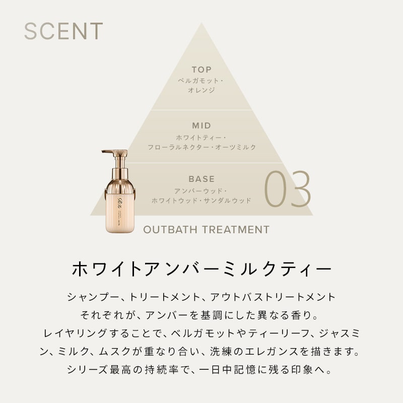シャンプー、トリートメント、アウトバストリートメントそれぞれが、アンバーを基調にした異なる香り。