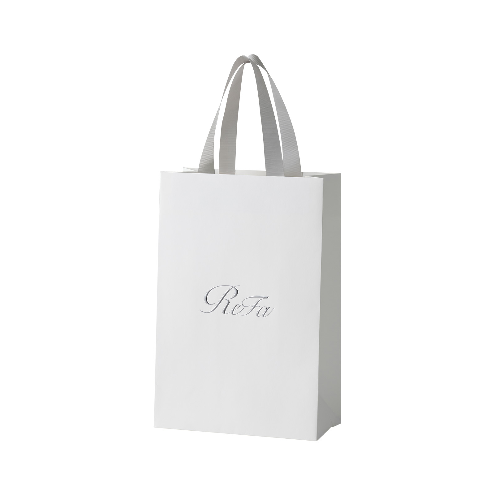 リファロゴが入った、白色のショッパーを6サイズ、ピンク色のショッパー、ドリンクショッパーもご用意しています。