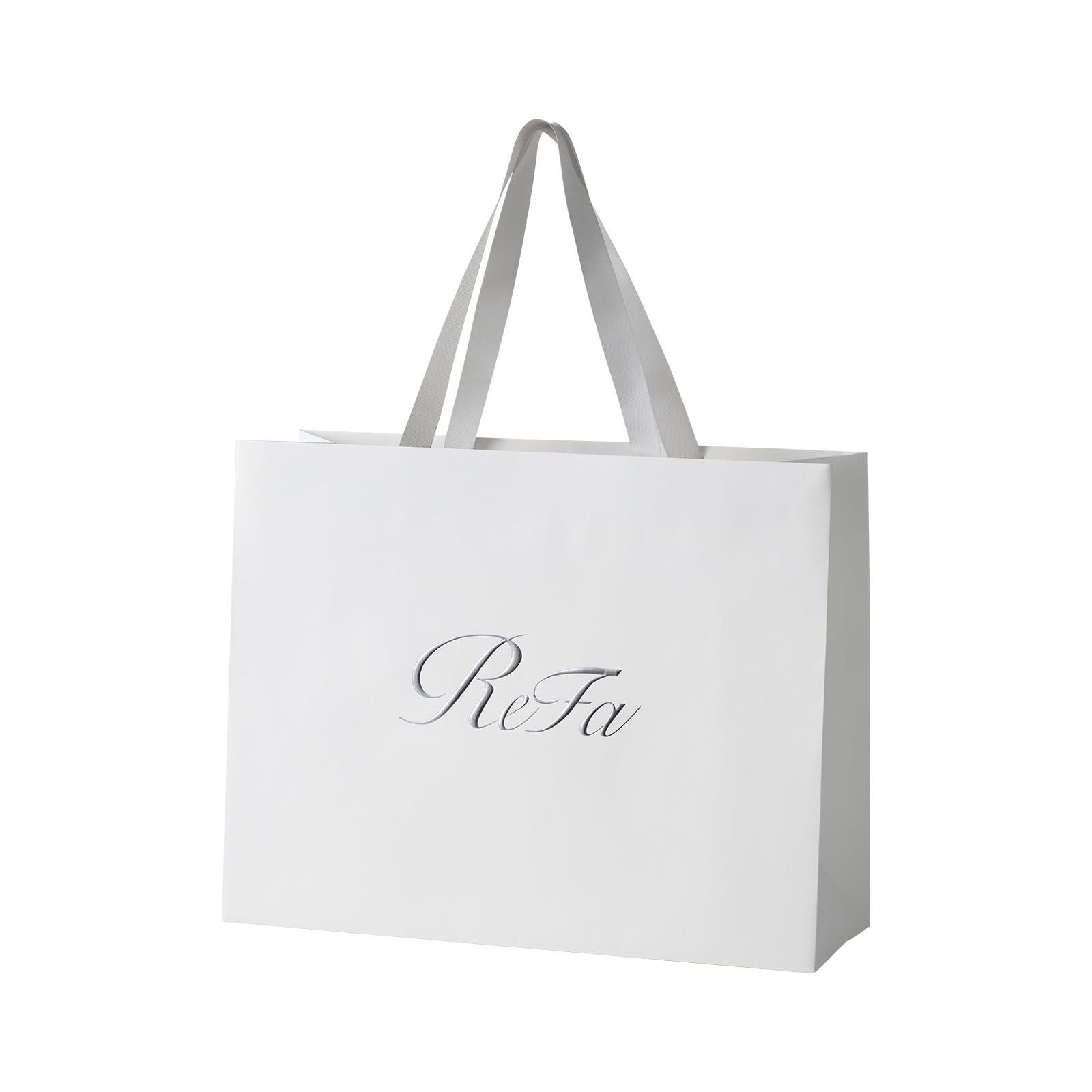 リファロゴが入った、白色のショッパーを6サイズ、ピンク色のショッパー、ドリンクショッパーもご用意しています。