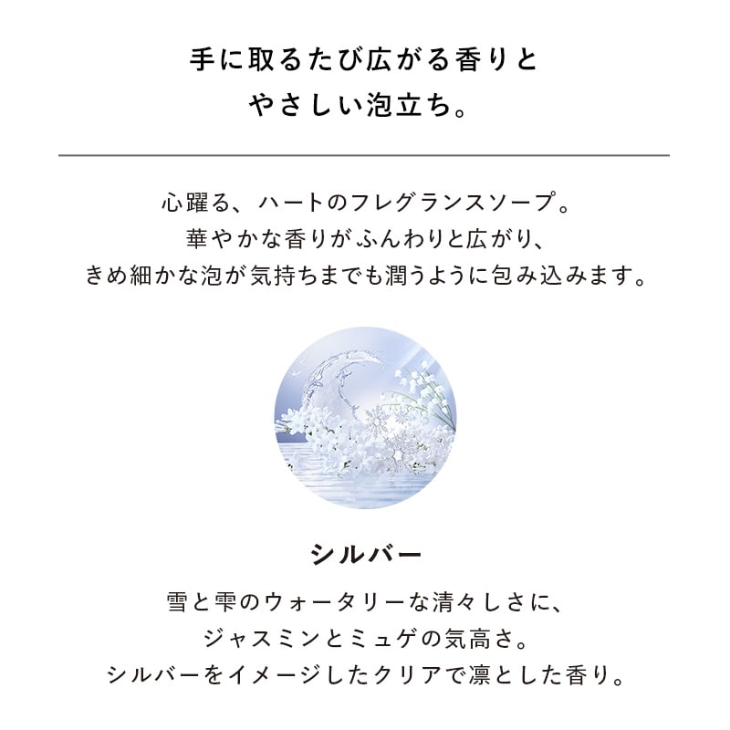雪と雫のウォータリーな清々しさに、ジャスミンとミュゲの気高さ。シルバーをイメージしたクリアで凛とした香り。