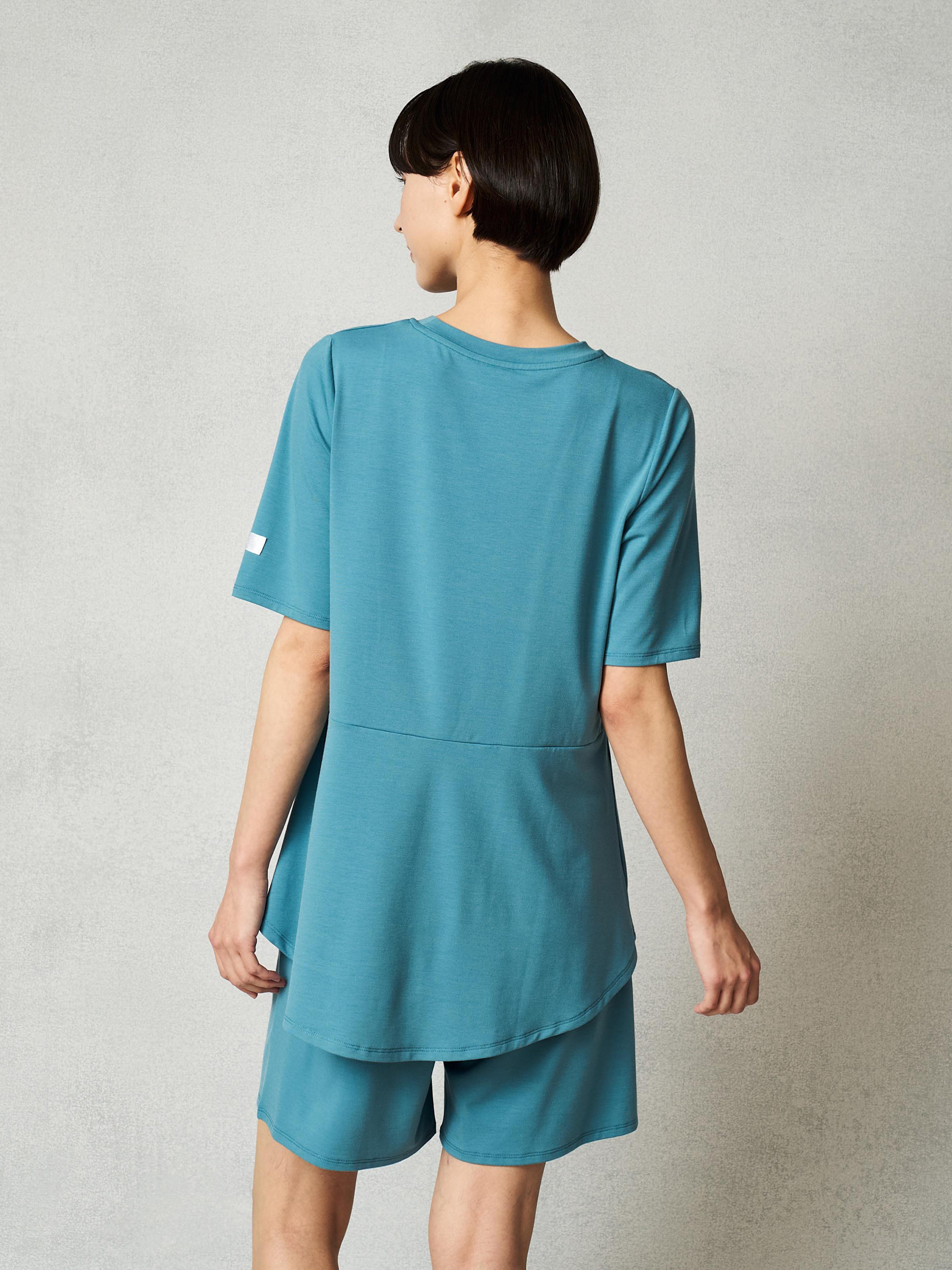 ゆとりのあるシルエットで、寝返りを打っても気にならない。部屋で過ごす時間も快適。 お尻をカバーする丈感、ペプラムシルエットで、着るだけでスタイルアップ。