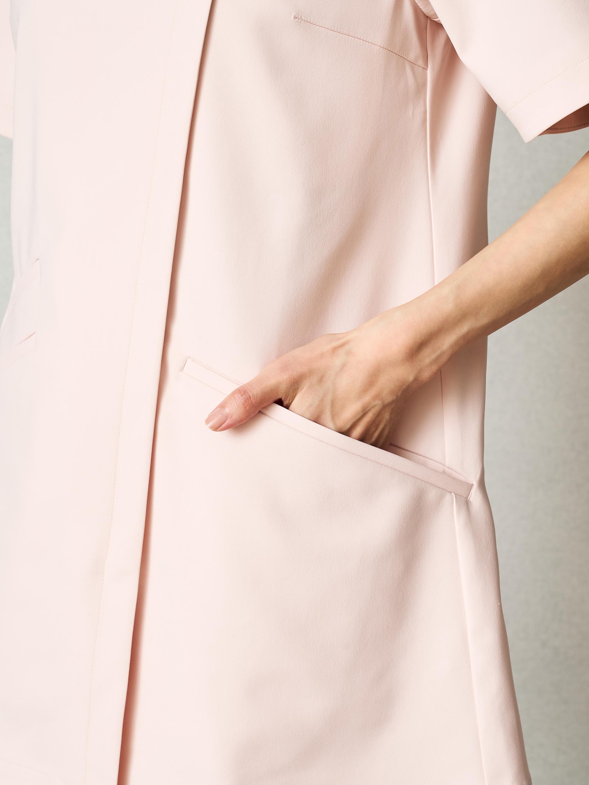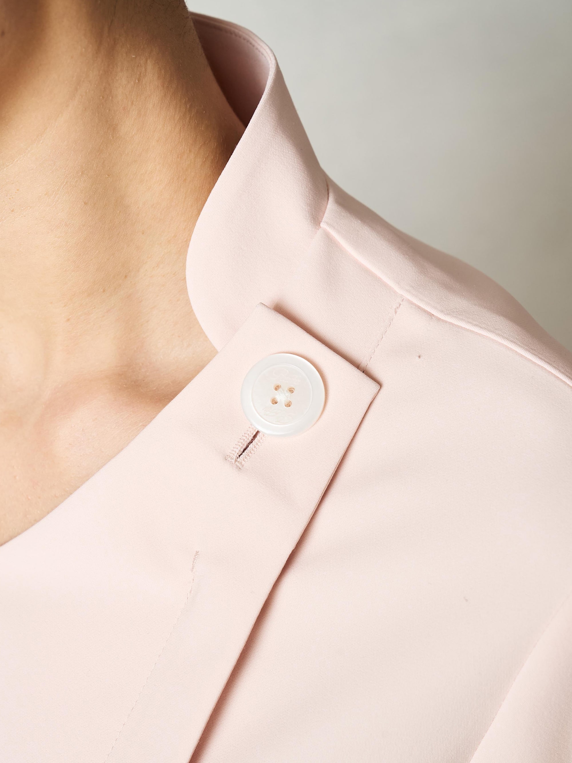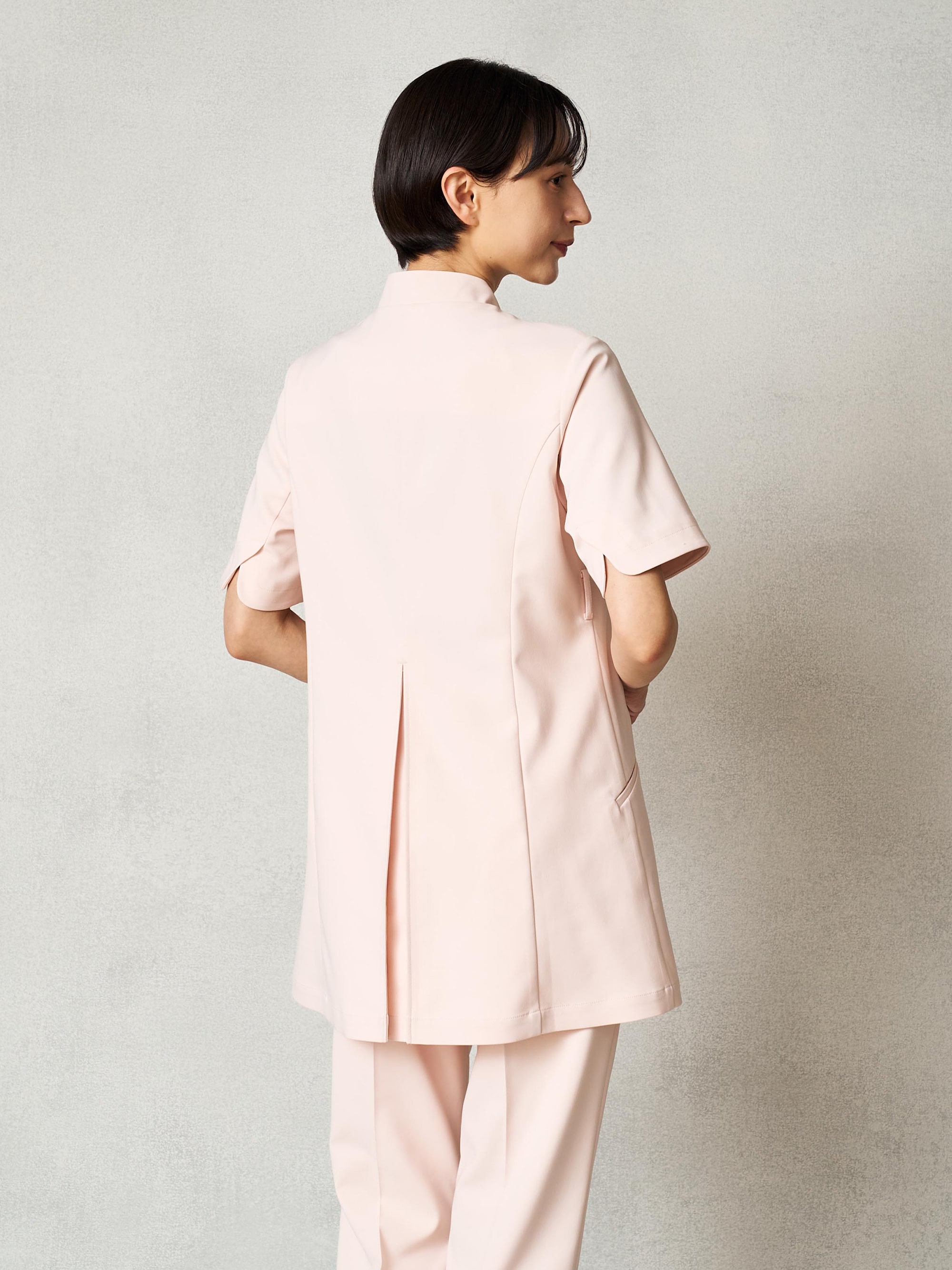 首元の血行促進をサポート。 スタンドカラーにVネックで顔周りがスッキリ。さらに、袖のラウンドスリットで腕もスッキリ見え、動きやすさを実現。