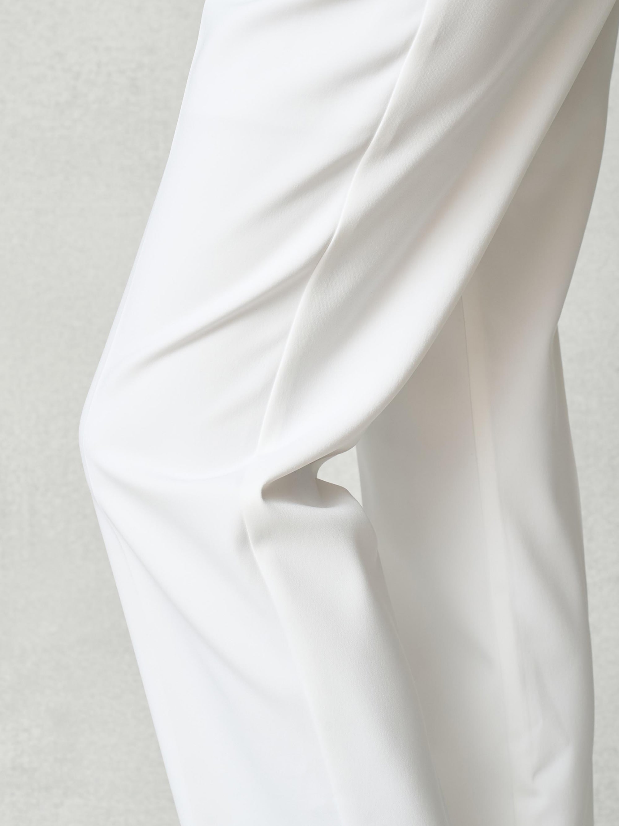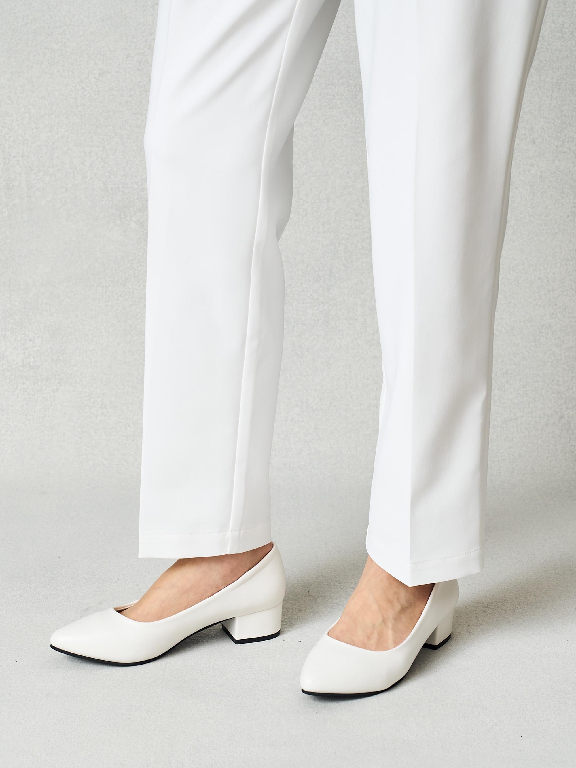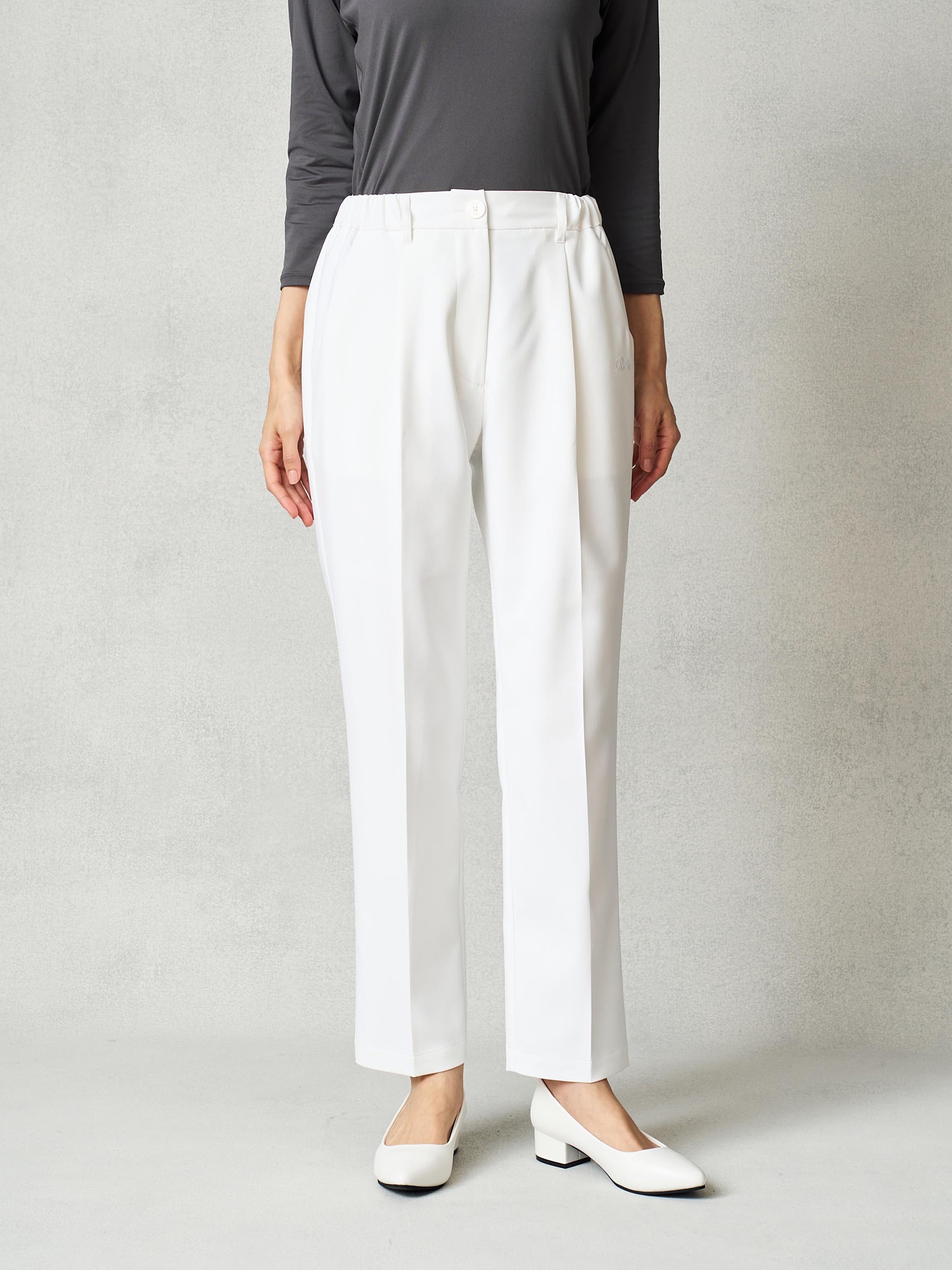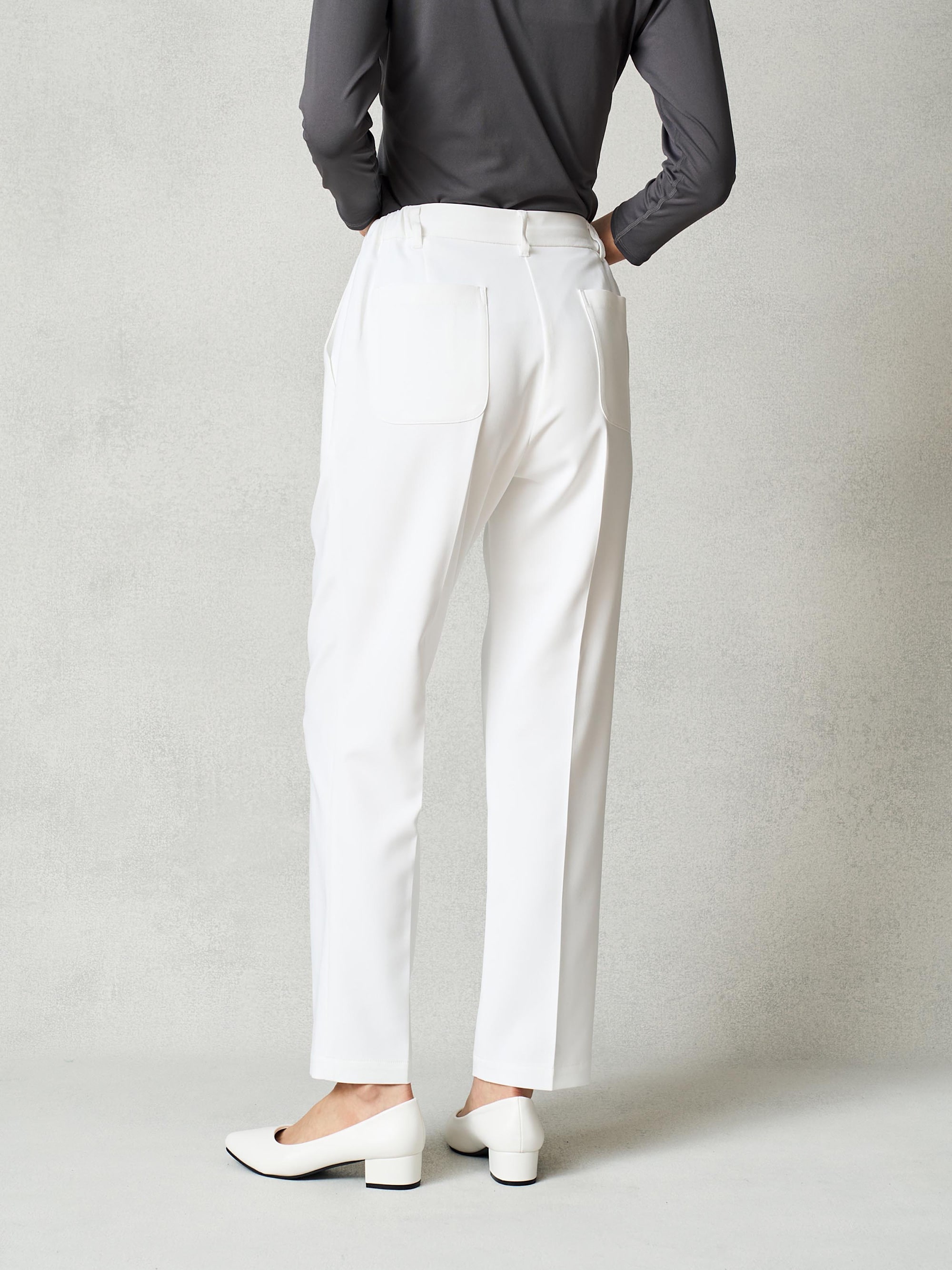 センタープレスで足のラインが綺麗に見える。 フロントはホックできちんと&スッキリ見え、白は透けにくい裏つき。三つ折りの裾で丈直しも簡単。
