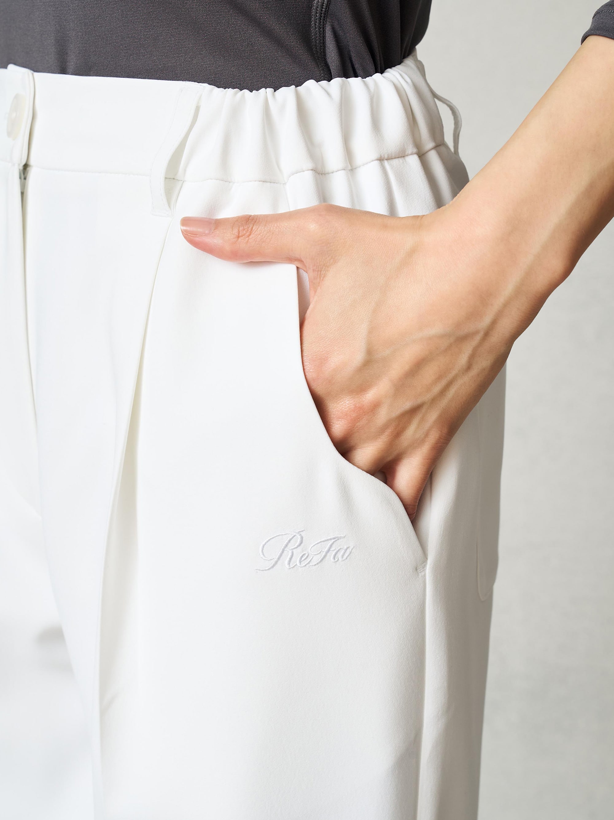 ウェストが後ろ側ゴムで穿きやすく、紐がついていて安定感も。前タックで腰回りが苦しくなく、股上深めでインナーも見えにくいシルエットです。