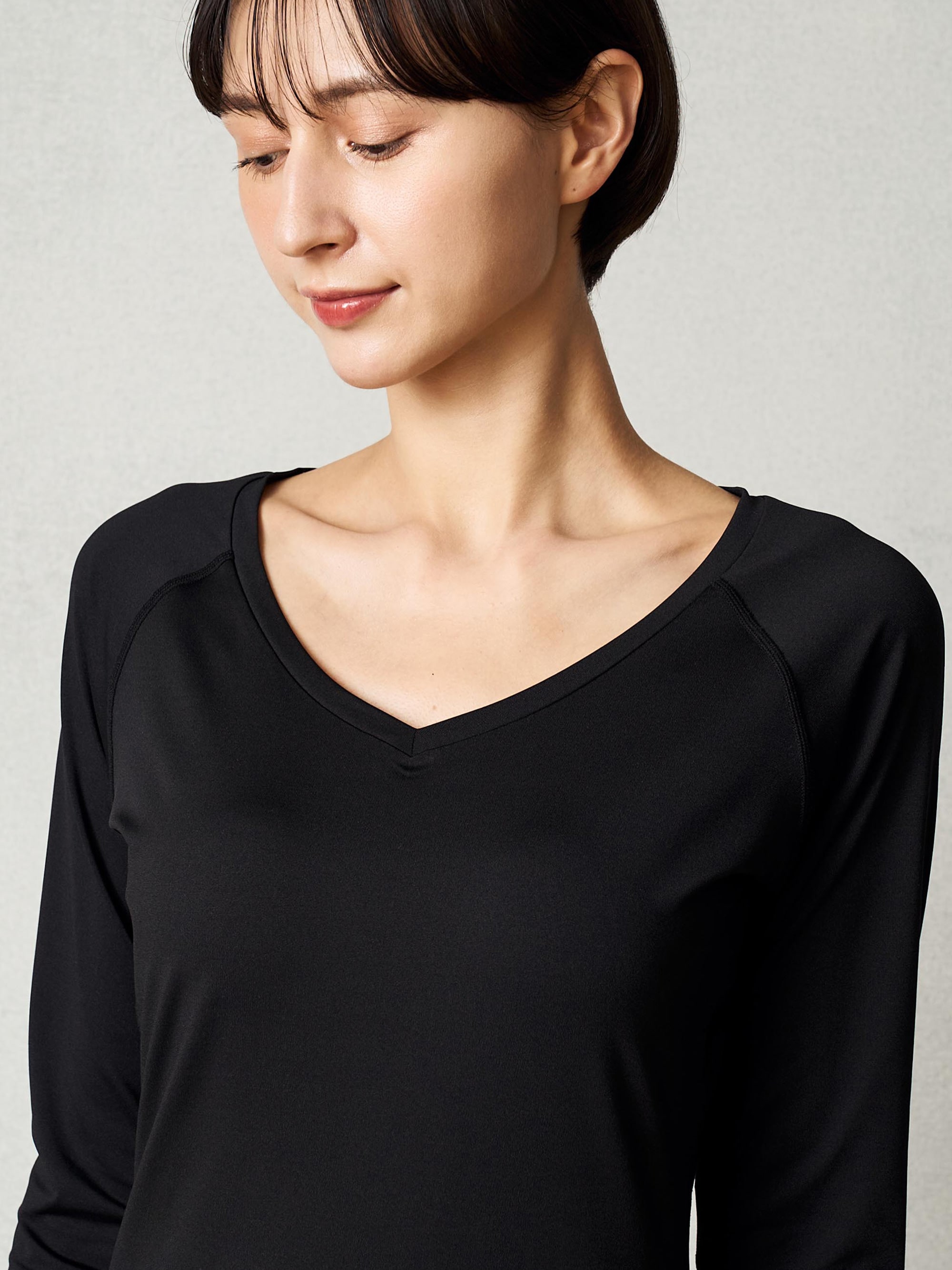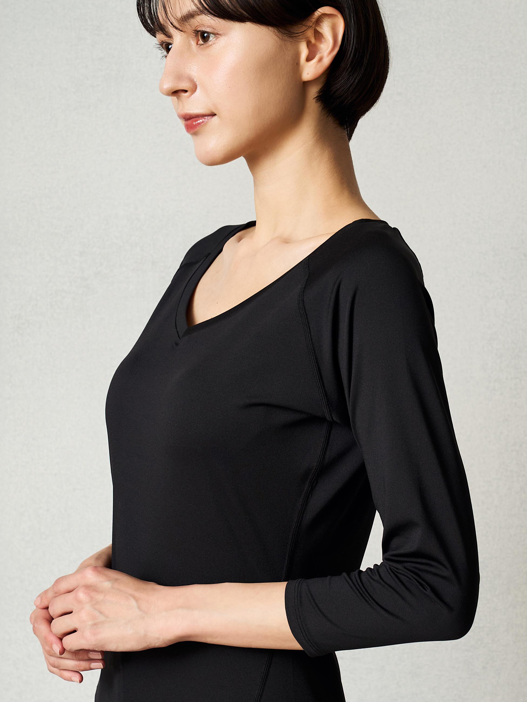 縫い目がフラットシーマで気にならない。 上からスクラブを着用しても響かないVネックインナー。