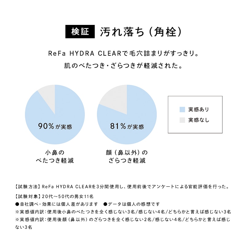 【試験方法】ReFa HYDRA CLEARを3分間使用し、使用前後でアンケートによる官能評価を行った。