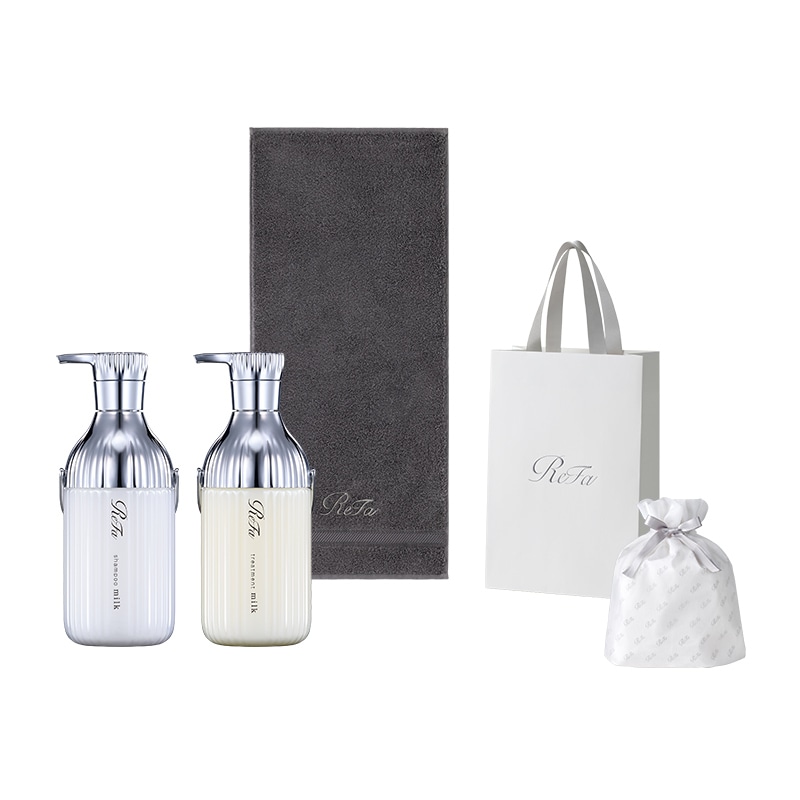 【ReFaギフトラッピングセット S】リファミルクプロテインシャンプー & トリートメント& リファヘアフェイスタオル(ダークグレー)