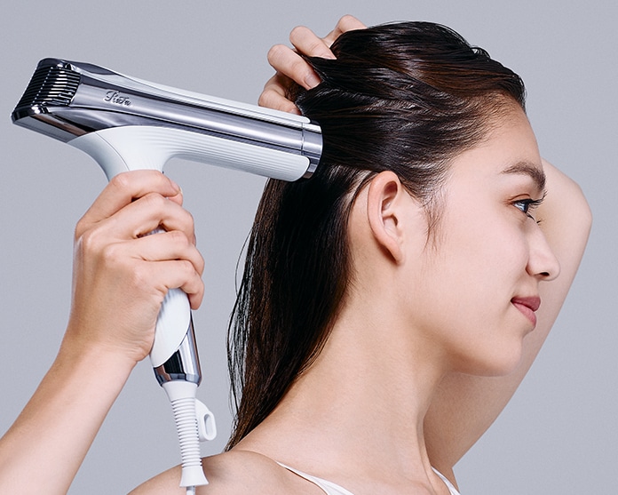 ブローの際は、ブラシを使い髪にテンションをかけながら、形をつくり、冷風で仕上げてスタイルをキープ。