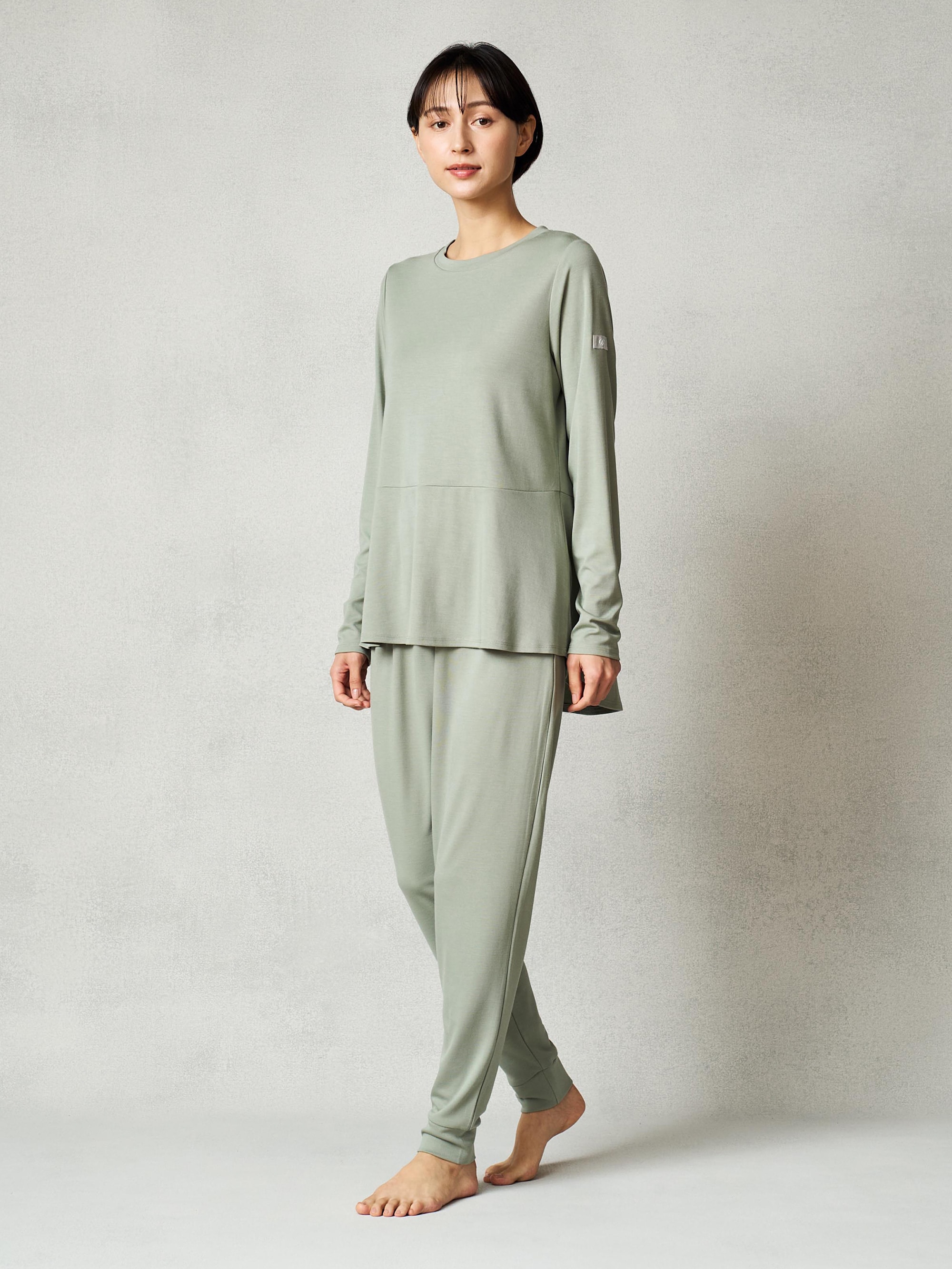 シルク素材を配合しているため、吸湿性に優れるとともに、肌にも優しい。リブ素材で伸縮性が高いため、ふんわり柔らかく締め付け感がない着心地の良い生地。