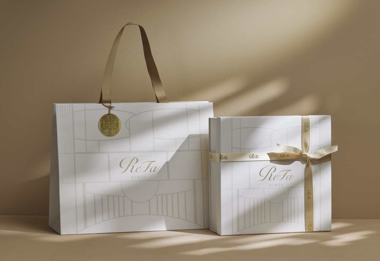 ReFa GINZAのシンボルであるスフィア空間をモチーフとした、ショッピングバッグ、ボックス、リボン、チャームからなる銀座限定のギフトラッピングサービスです。お好きな商品1つからギフト包装いたします。