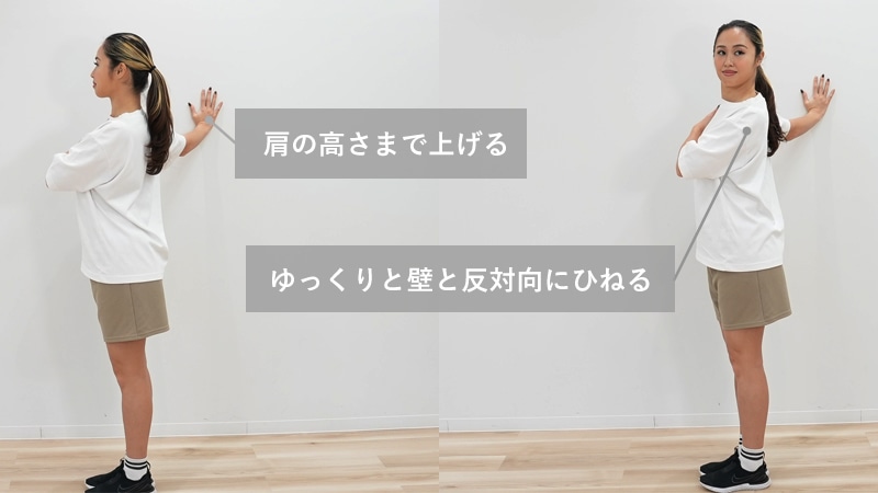 手を壁につけたまま上体をゆっくりと壁と反対向きにひねる。