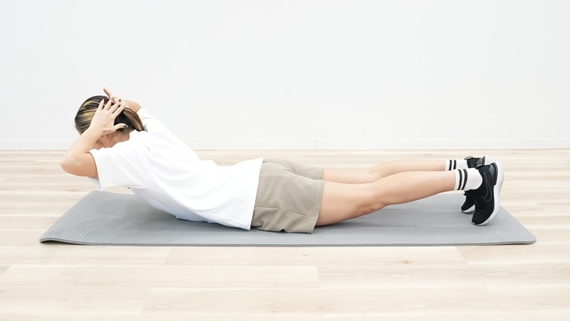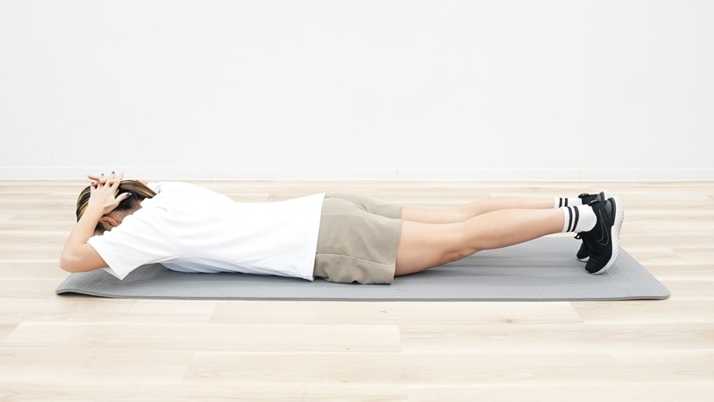うつ伏せになり、両手を頭の後ろで組む。