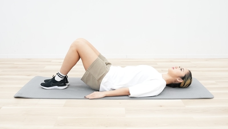 仰向けの状態でひざを立て、手のひらを下にして両手をつく。