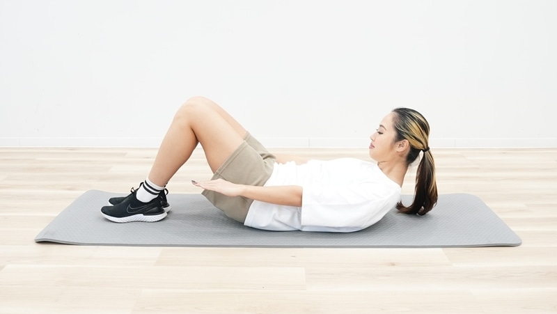 みぞおちを中心に上体を丸めるように起こすことで、腹部が縮まって腹直筋に効果的にアプローチすることができ