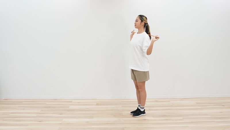 ゴルフクラブを地面と水平に持ち、頭の後ろに抱えた状態でまっすぐ立つ。