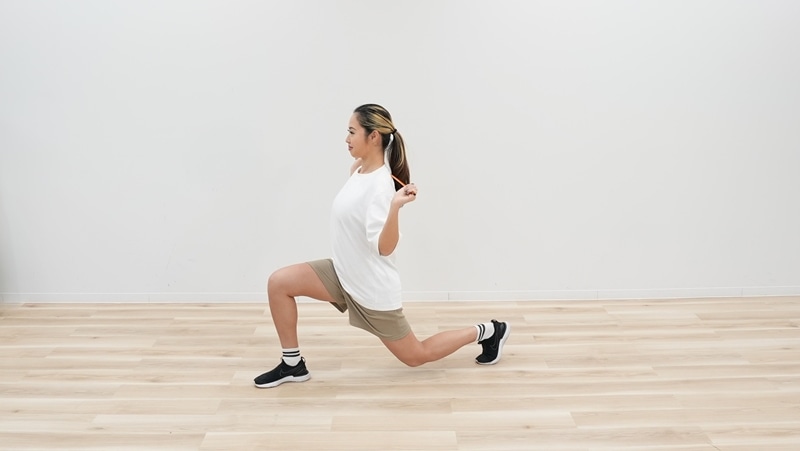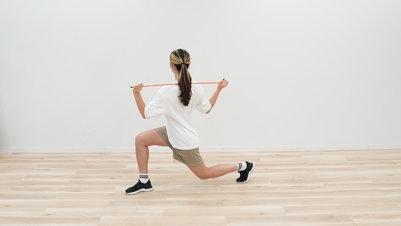 一歩踏み出してランジ動作をするとき、上半身を捻じるときと丁寧な動作を心がけ、体幹と下半身にしっかりと負荷がかかるようにしましょう。