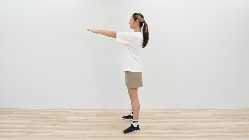 足を肩幅くらいに開いて立ち、両手は床に平行になるように前方に伸ばすか胸の前でクロスする。